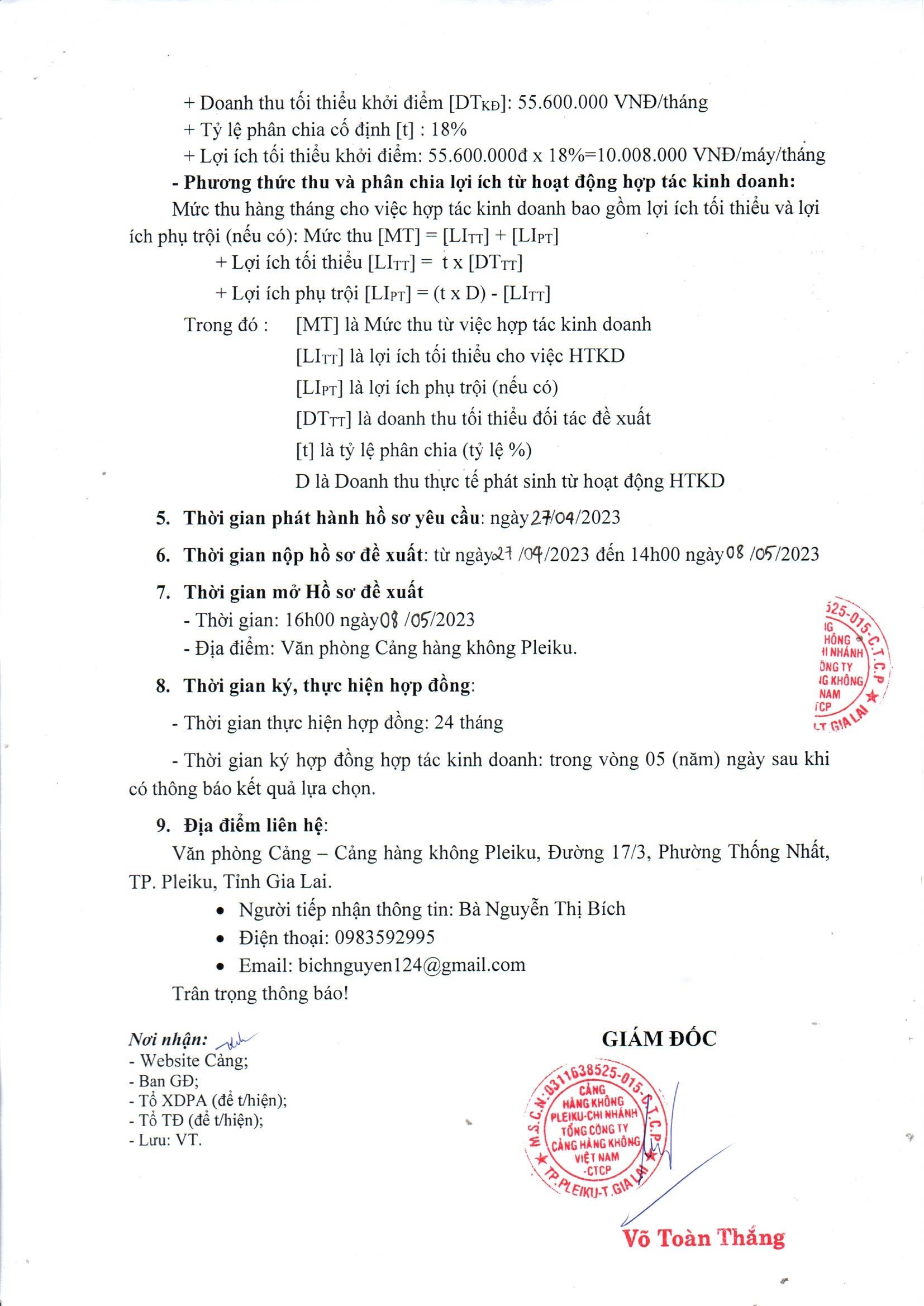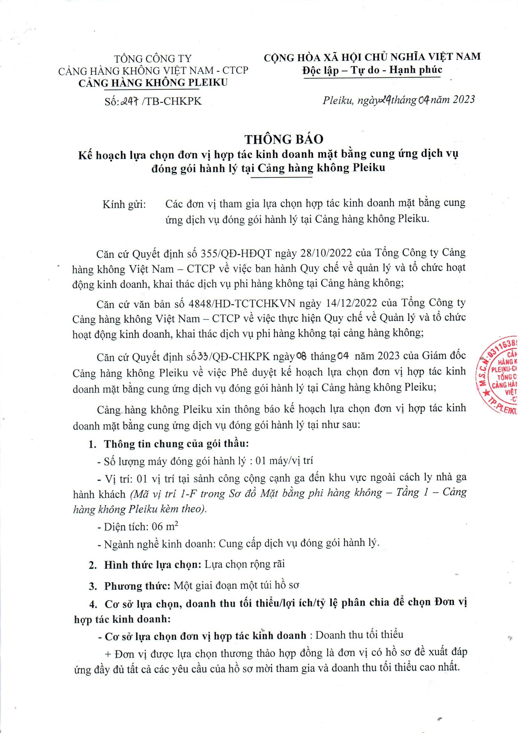 Thông báo: Kế hoạch lựa chọn đơn vị hợp tác kinh doanh mặt bằng cung ứng dịch vụ đóng gói hành lý tại Cảng hàng không Pleiku