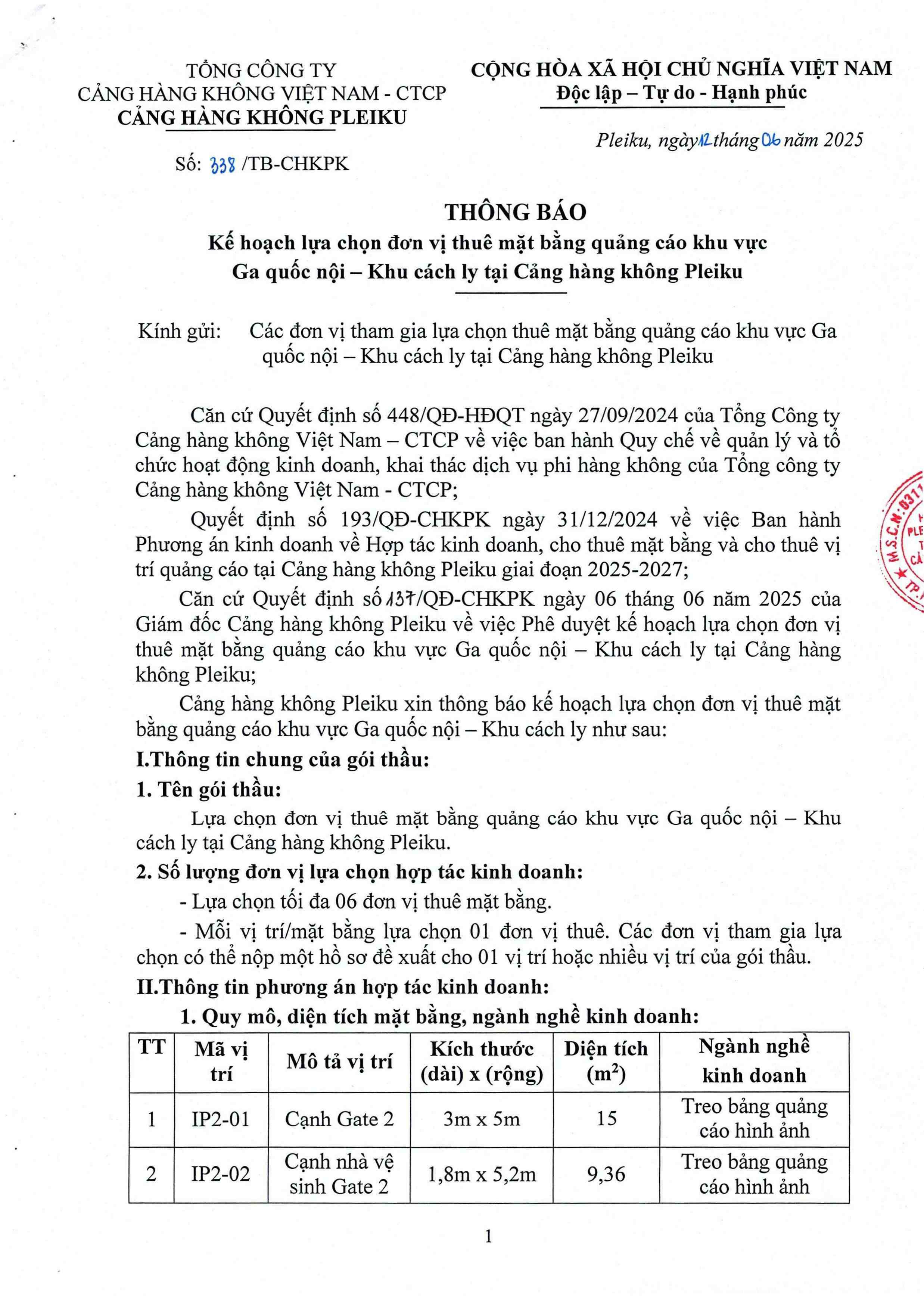 Thông báo kế hoạch lựa chọn đơn vị thuê mặt bằng quảng cáo khu vực Ga quốc nội - Khu cách ly tại Cảng hàng không Pleiku