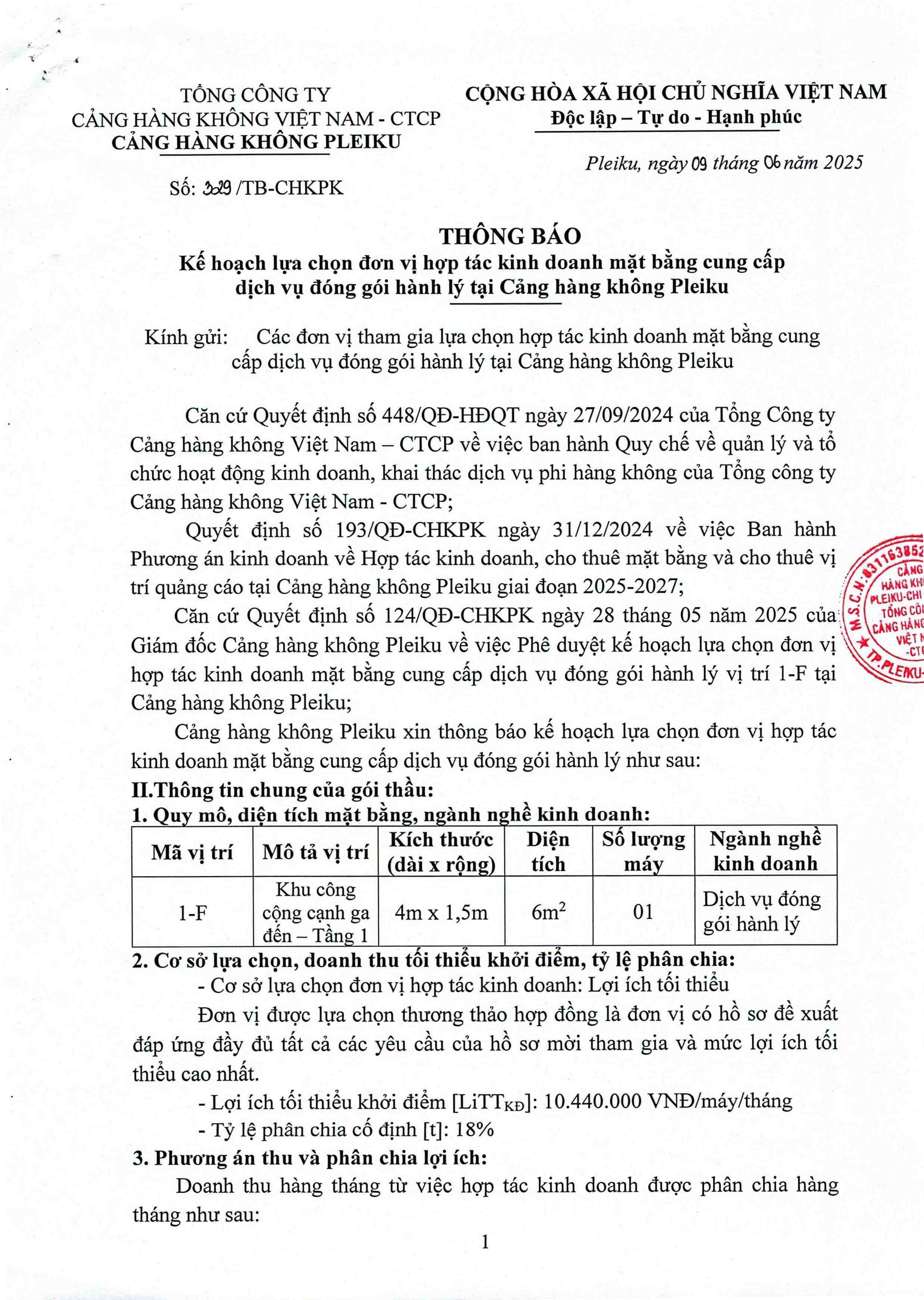 Thông báo Kế hoạch lựa chọn đơn vị thuê mặt bằng cung cấp dịch vụ đóng gói hành lý tại Cảng hàng không Pleiku