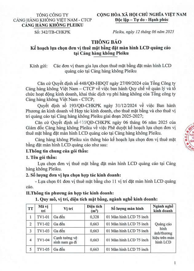 Thông báo kế hoạch lựa chọn đơn vị thuê mặt bằng đặt màn hình LCD quảng cáo tại Cảng hàng không Pleiku