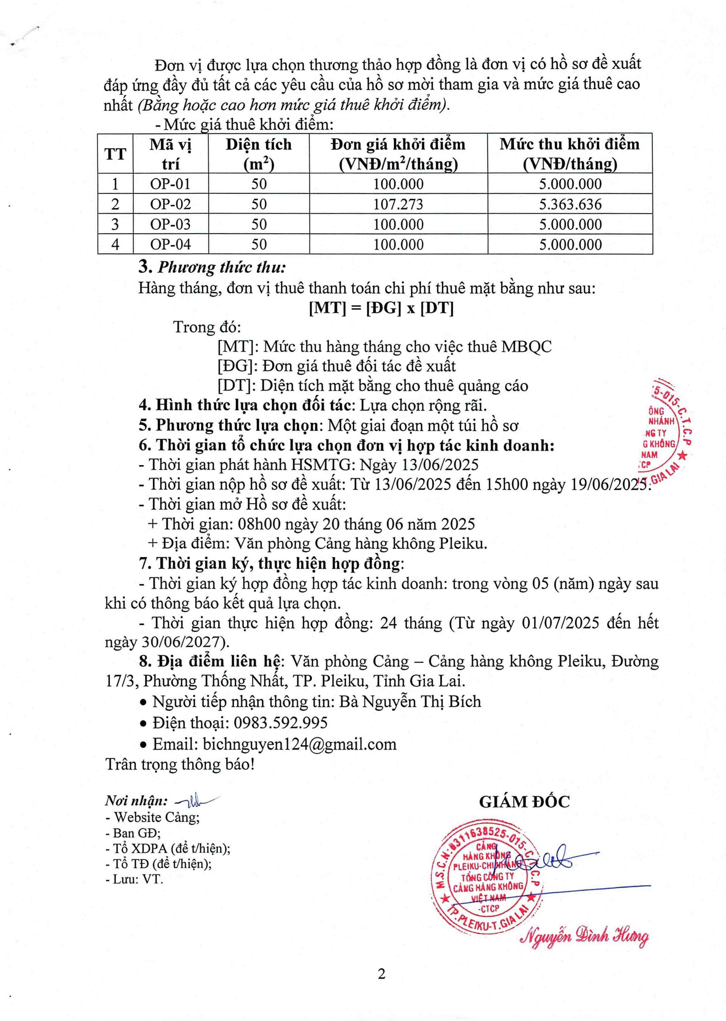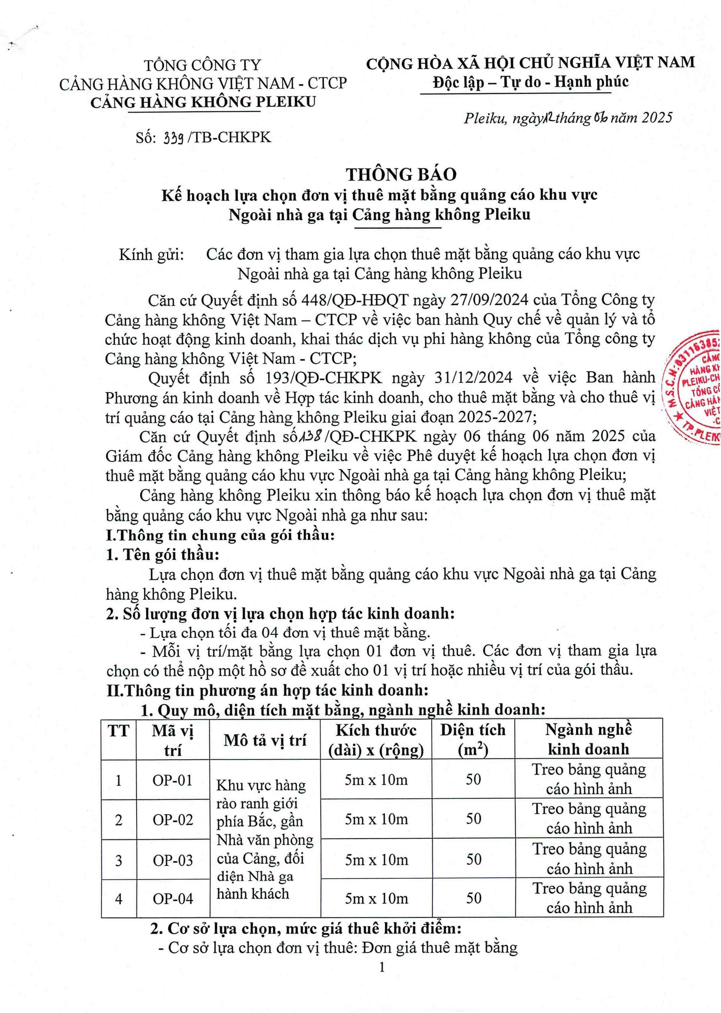 Thông báo kế hoạch lựa chọn đơn vị thuê mặt bằng quảng cáo khu vực Ngoài nhà ga tại Cảng hàng không Pleiku