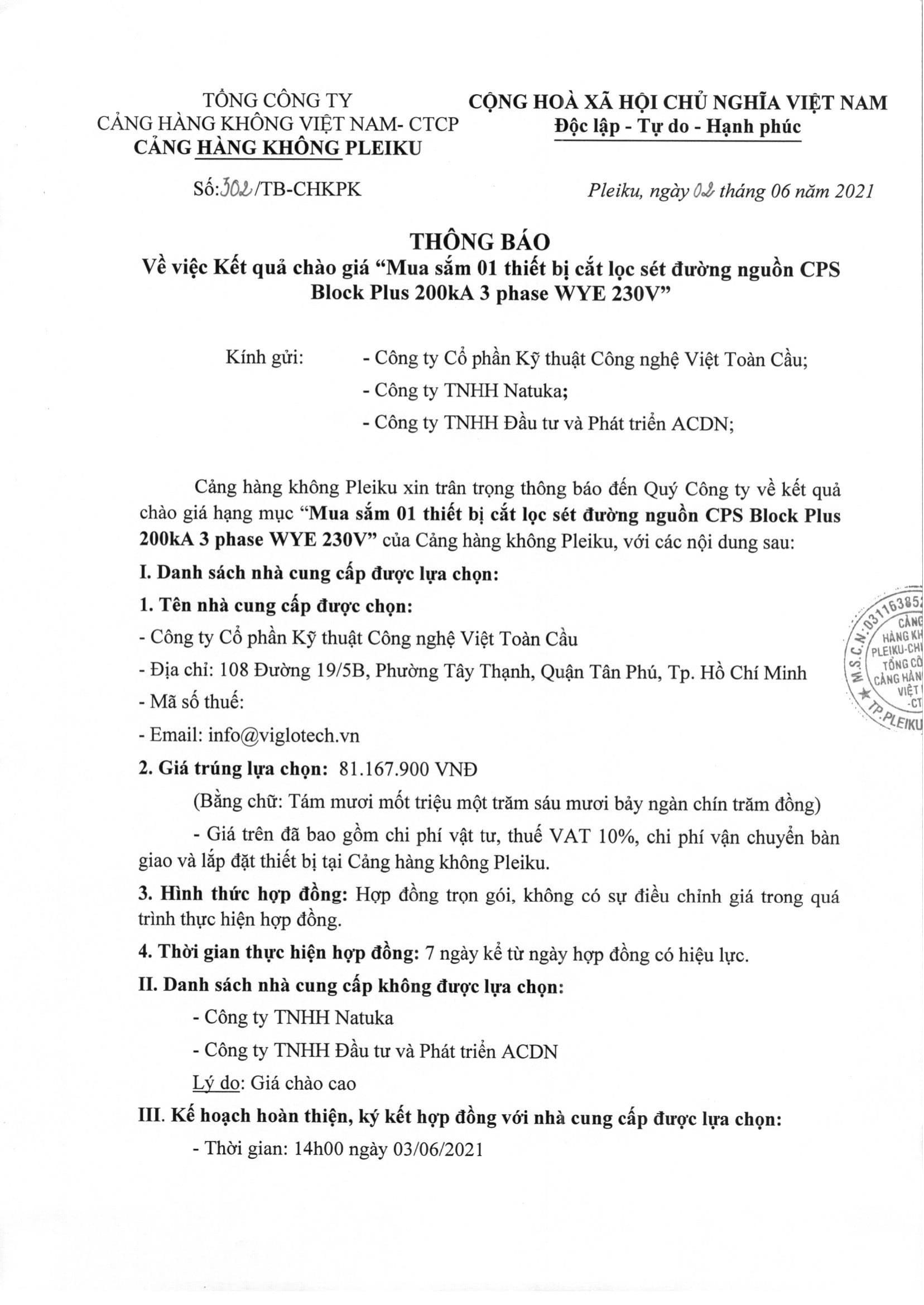 Thông báo về việc Kết quả chào giá “Cung cấp và lắp đặt hệ thống cảnh báo an toàn cho xe thang hành khách tại Cảng hàng không Pleiku”