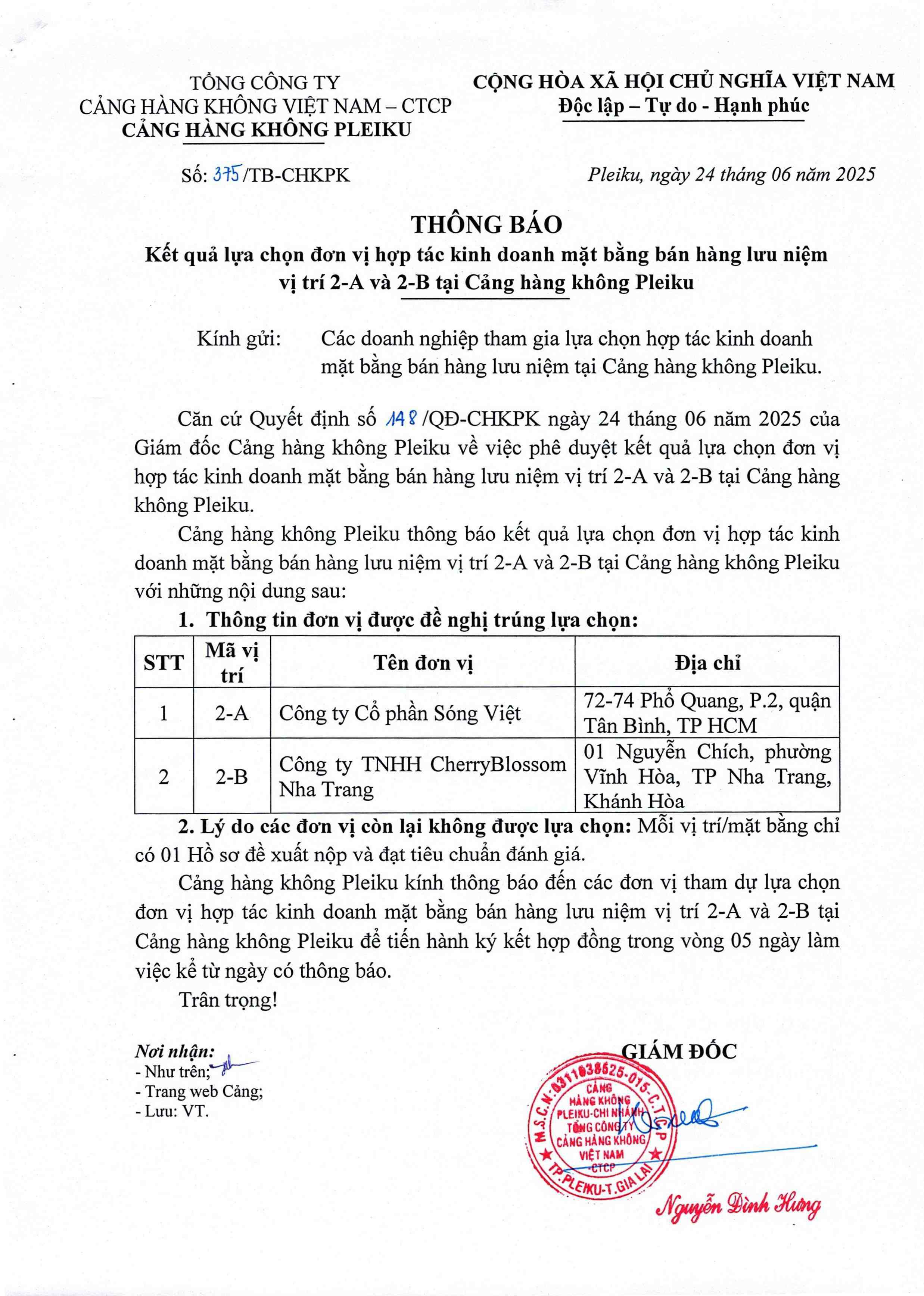 Thông báo kết quả lựa chọn đơn vị hợp tác kinh doanh mặt bằng bán hàng lưu niệm vị trí 2A và 2B tại Cảng hàng không Pleiku