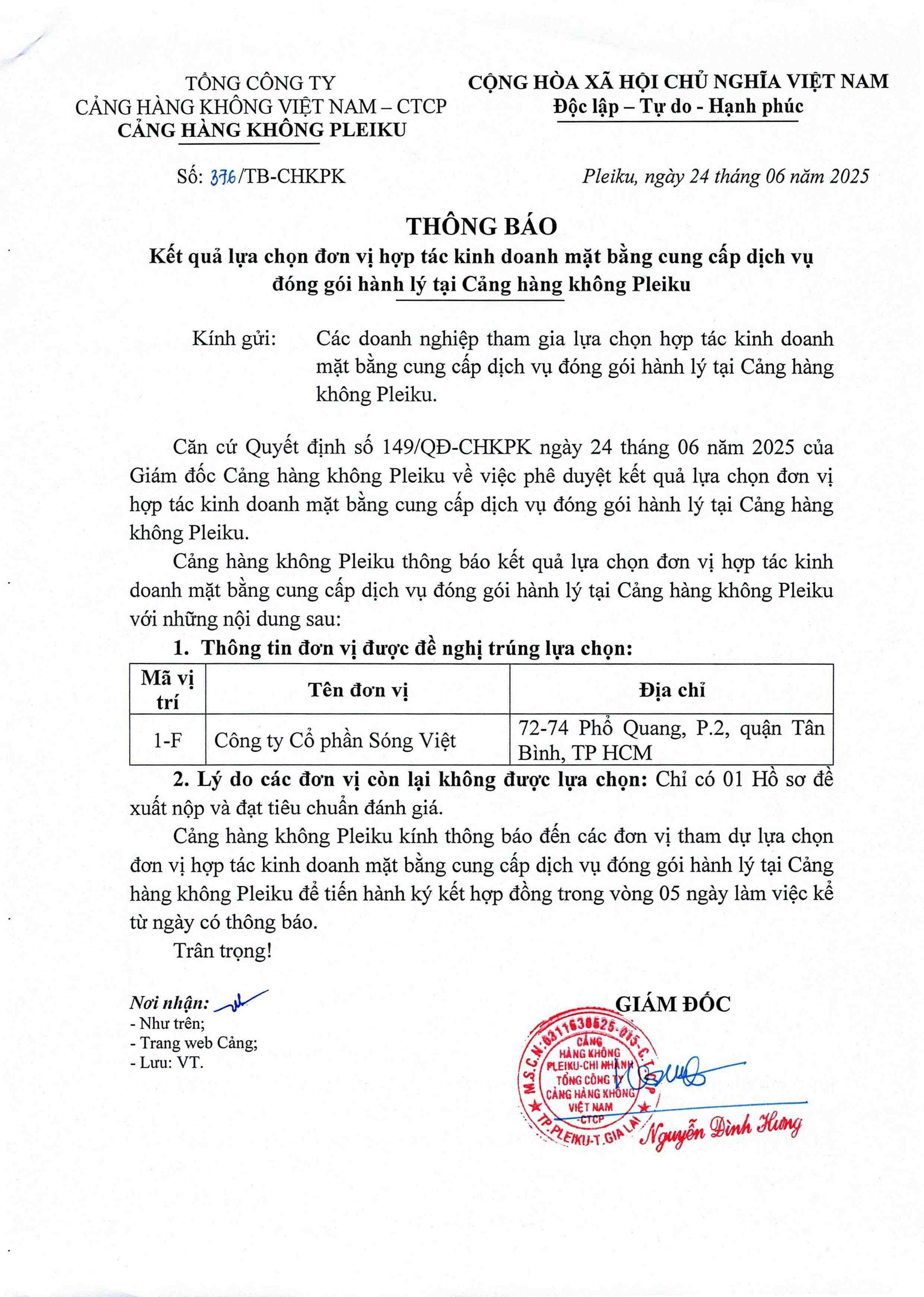 Thông báo kết quả lựa chọn đơn vị thuê mặt bằng cung cấp dịch vụ đóng gói hành lý tại Cảng hàng không Pleiku