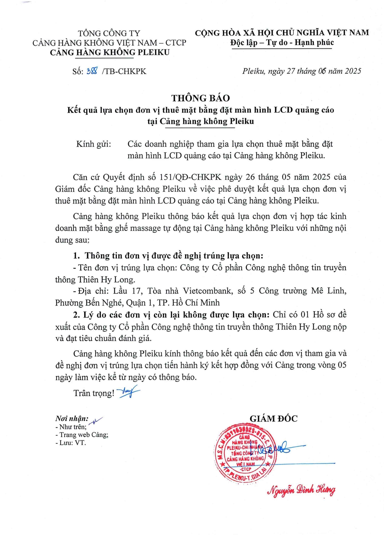 Thông báo kết quả lựa chọn đơn vị thuê mặt bằng đặt màn hình LCD quảng cáo tại Cảng hàng không Pleiku