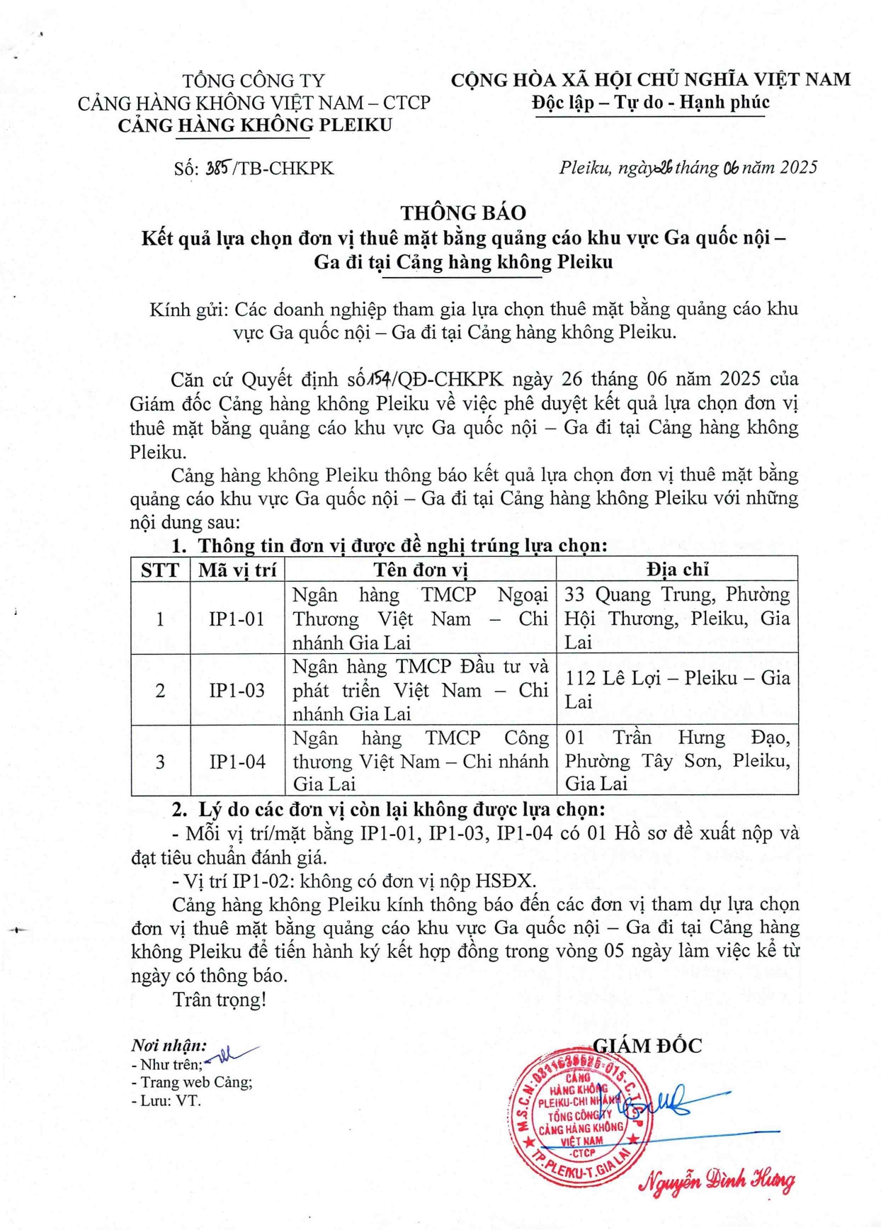 Thông báo kết quả lựa chọn đơn vị thuê mặt bằng quảng cáo khu vực ga quốc nội - Ga đi tại Cảng hàng không Pleiku