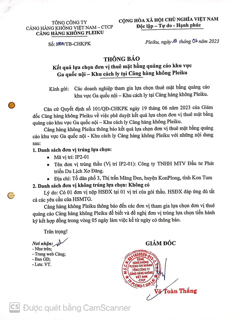 Thông báo kết quả lựa chọn đơn vị thuê mặt bằng quảng cáo Khu vực ga quốc nội - Khu cách ly tại Cảng hàng không Pleiku