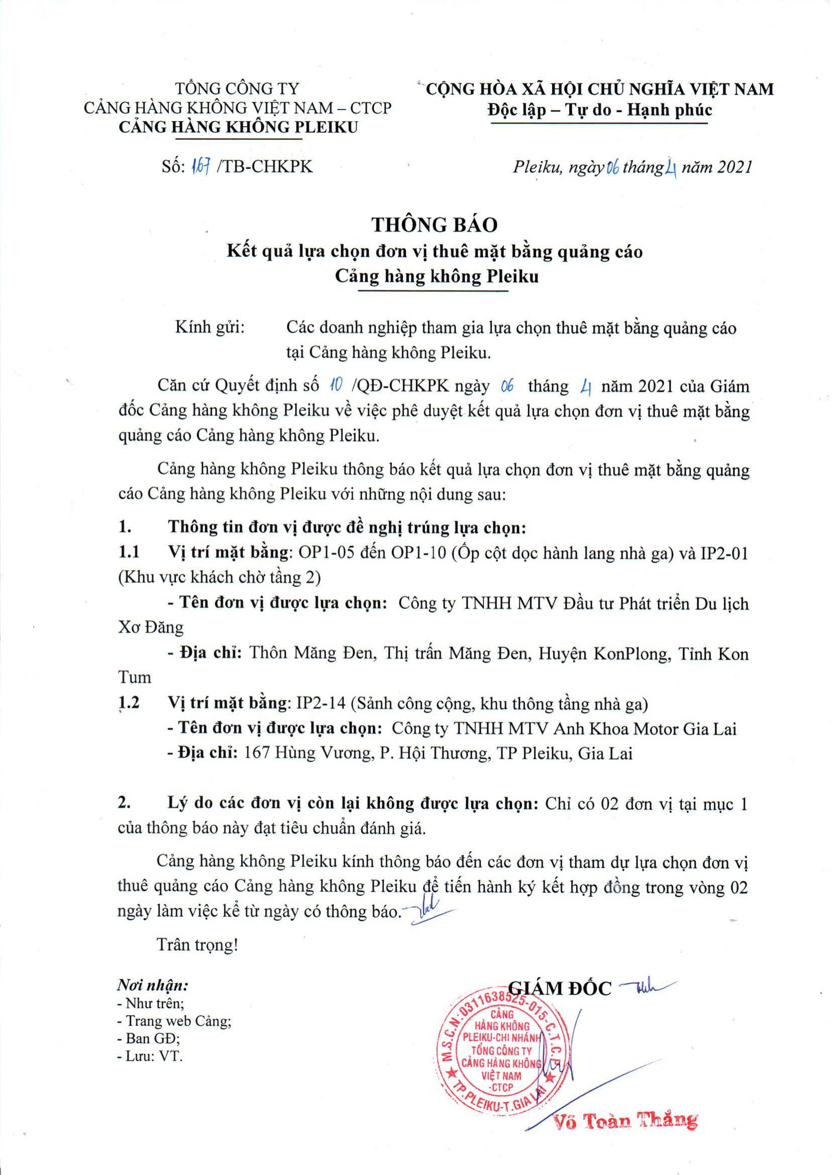 Thông báo kết quả lựa chọn đơn vị thuê mặt bằng quảng cáo tại Cảng hàng không Pleiku