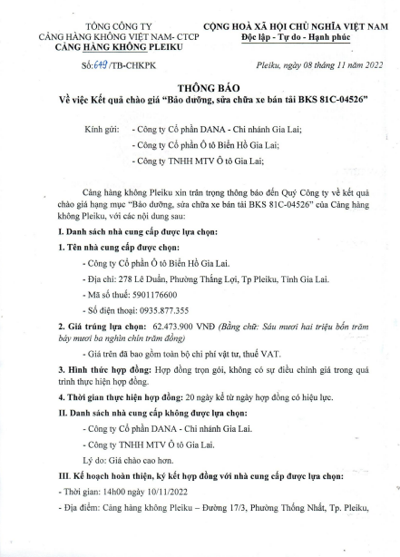 Thông báo kết quả về việc mời chào giá "Bảo dưỡng, sửa chữa xe bán tải Navara tại Cảng hàng không Pleiku"