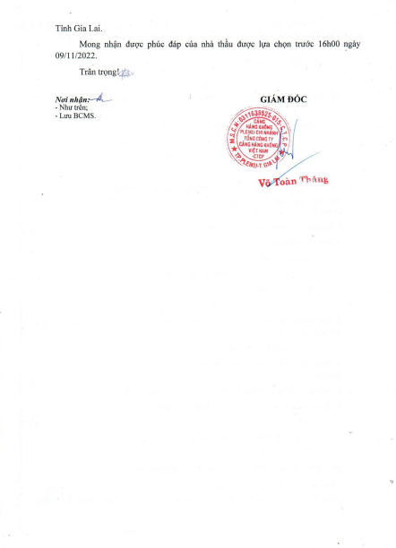 Thông báo về việc Kết quả chào giá “Cung cấp và lắp đặt hệ thống cảnh báo an toàn cho xe thang hành khách tại Cảng hàng không Pleiku”