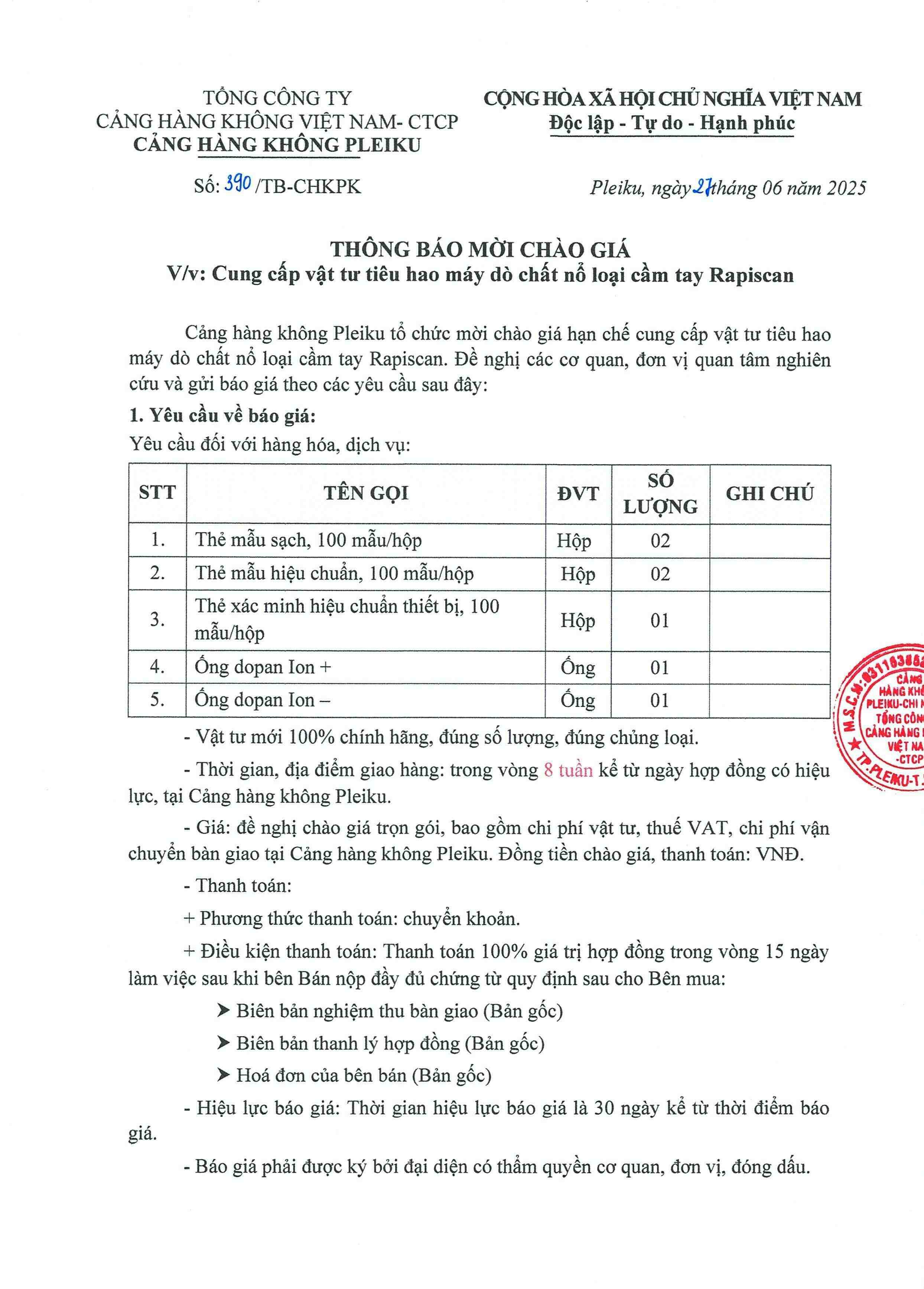 Thông báo mời chào giá về việc "Bảo dưỡng định kỳ hệ thống xử lý nước thải sinh hoạt 06 tháng cuối năm 2025 tại Cảng hàng không Pleiku"