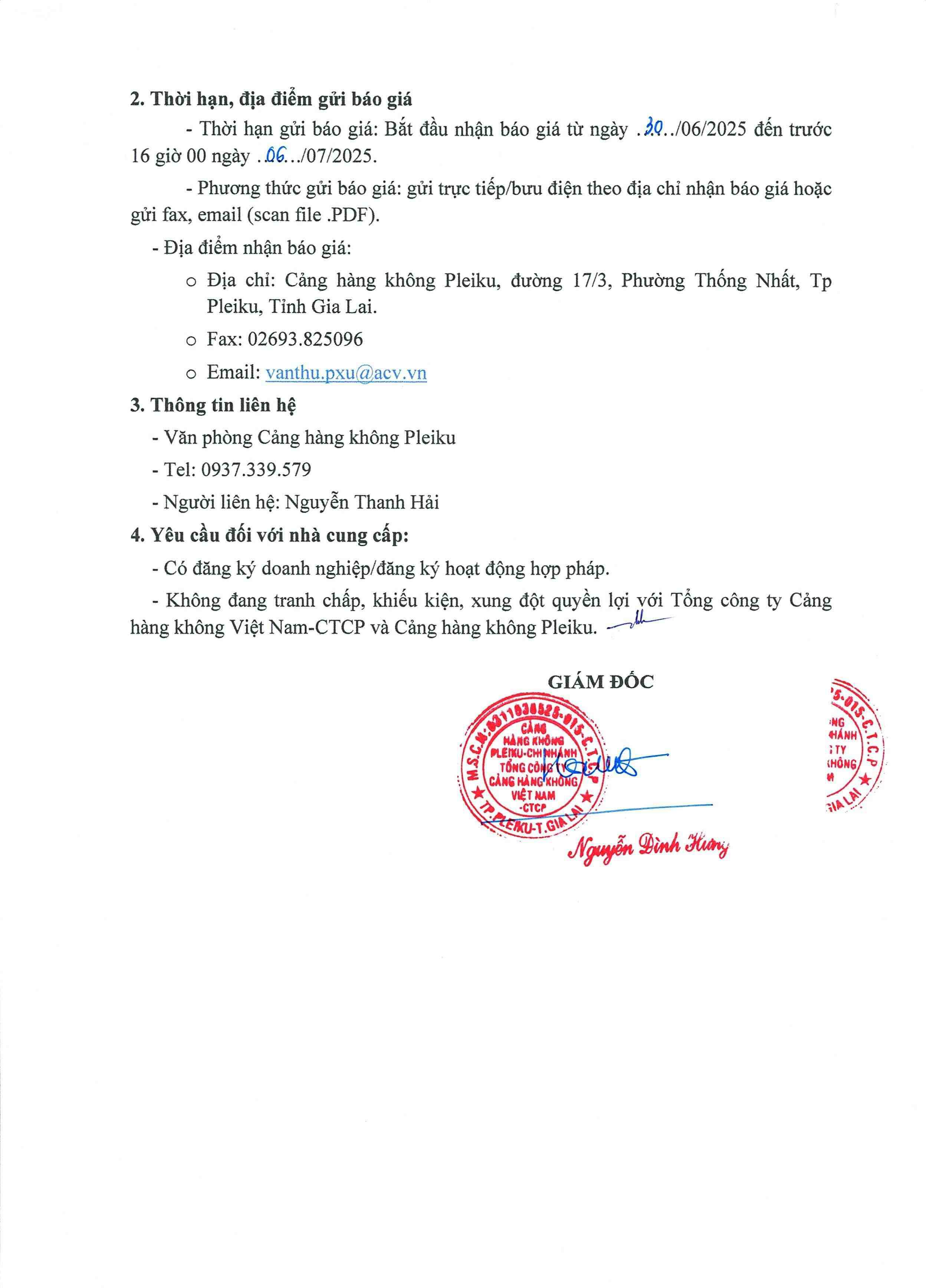 Thông báo về việc Kết quả chào giá “Bảo dưỡng định kỳ hệ thống xử lý nước thải sinh hoạt 06 tháng cuối năm 2025 tại Cảng hàng không Pleiku”