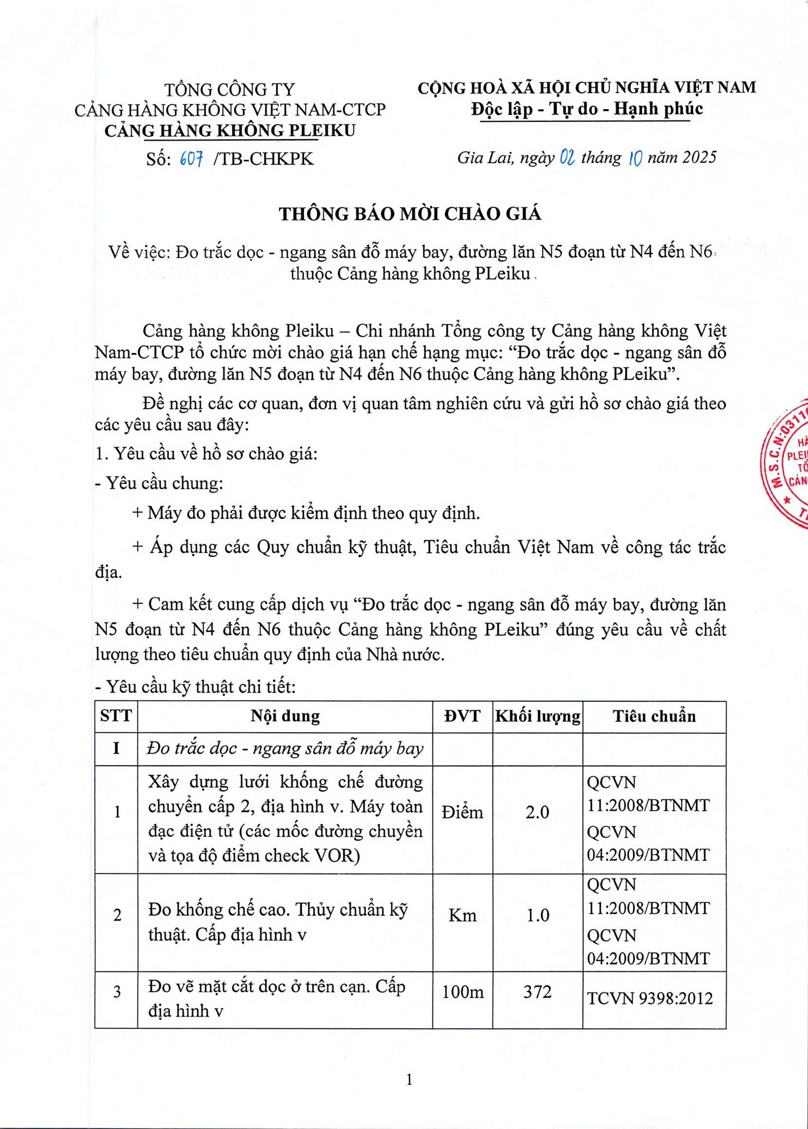 Thông báo mời chào giá về việc "Bảo dưỡng định kỳ hệ thống xử lý nước thải sinh hoạt 06 tháng cuối năm 2025 tại Cảng hàng không Pleiku"