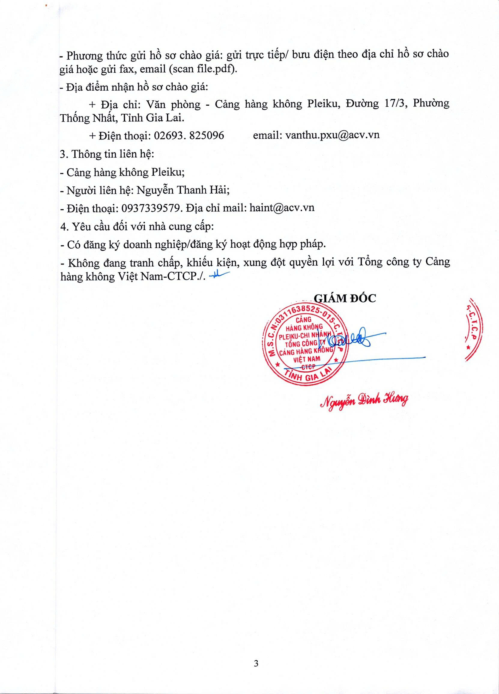 Thông báo về việc Kết quả chào giá “Cung cấp và lắp đặt hệ thống cảnh báo an toàn cho xe thang hành khách tại Cảng hàng không Pleiku”