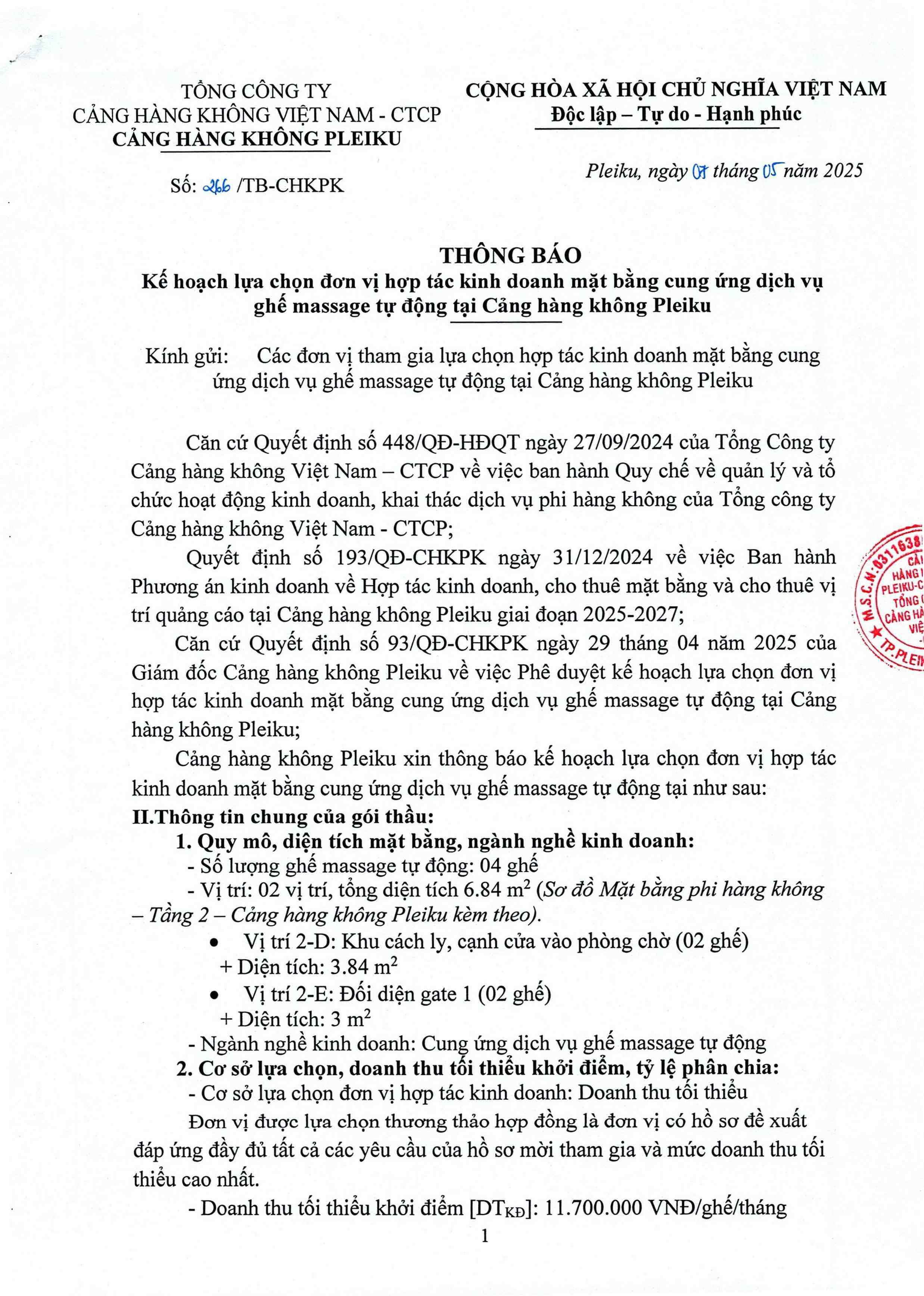 Thông báo mời chào giá: Kế hoạch lựa chọn đơn vị hợp tác kinh doanh mặt bằng cung ứng dịch vụ ghế massage tự động tại Cảng hàng không Pleiku