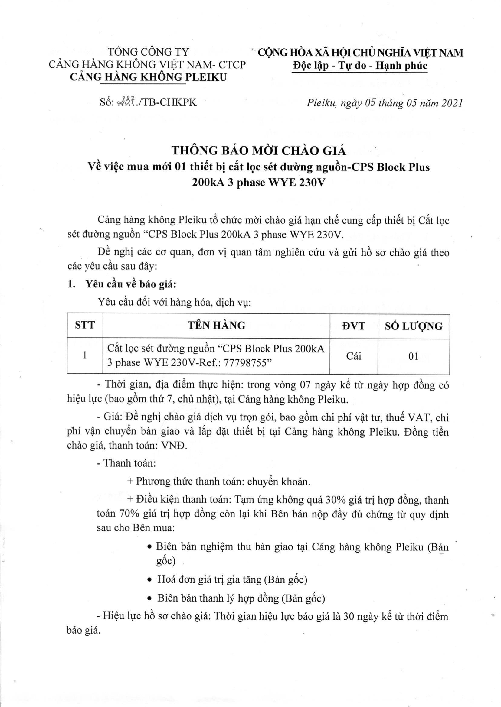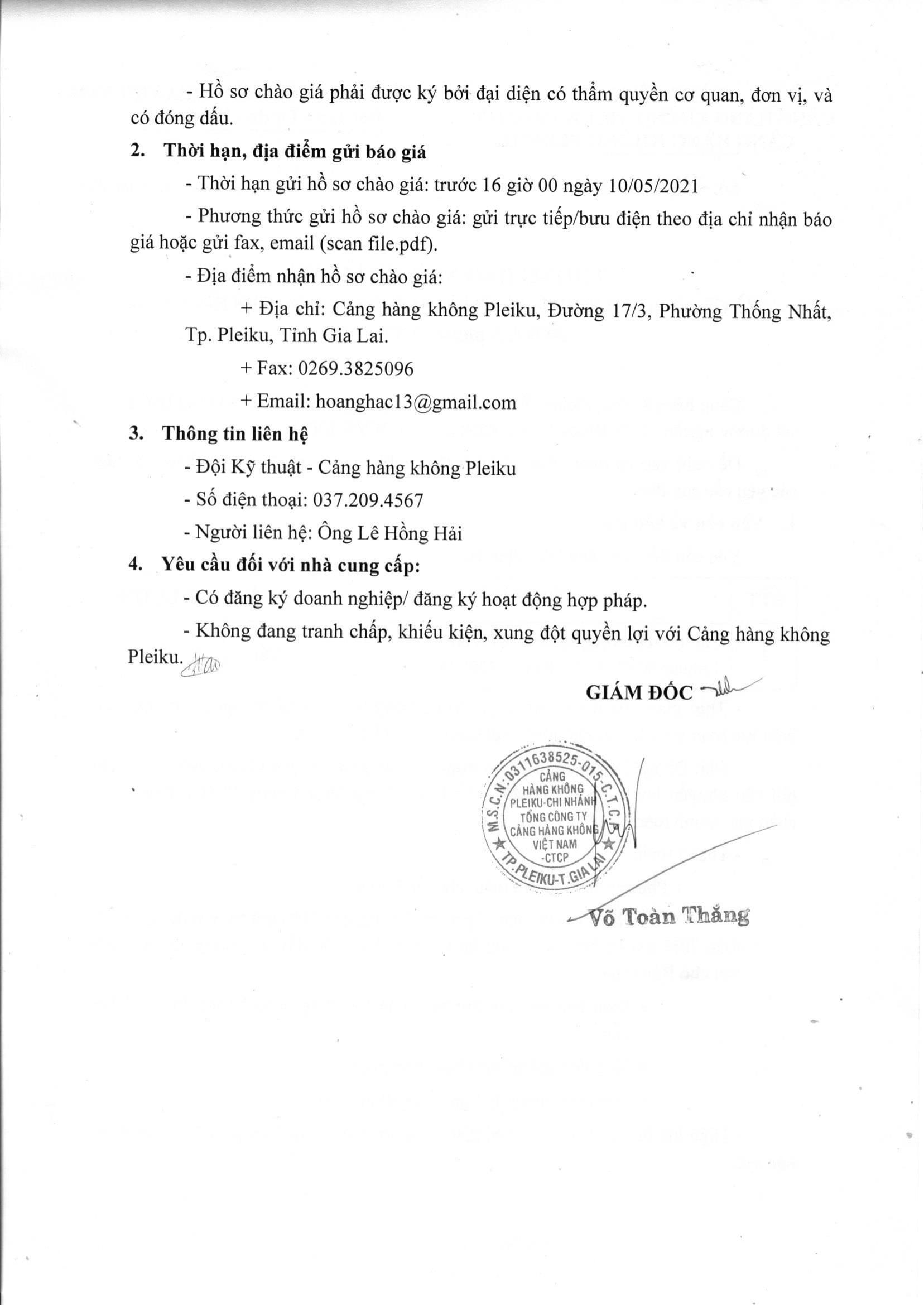 Thông báo mời chào giá về việc "Cung cấp và lắp đặt hệ thống cảnh báo an toàn cho xe thang hành khách tại Cảng hàng không Pleiku"