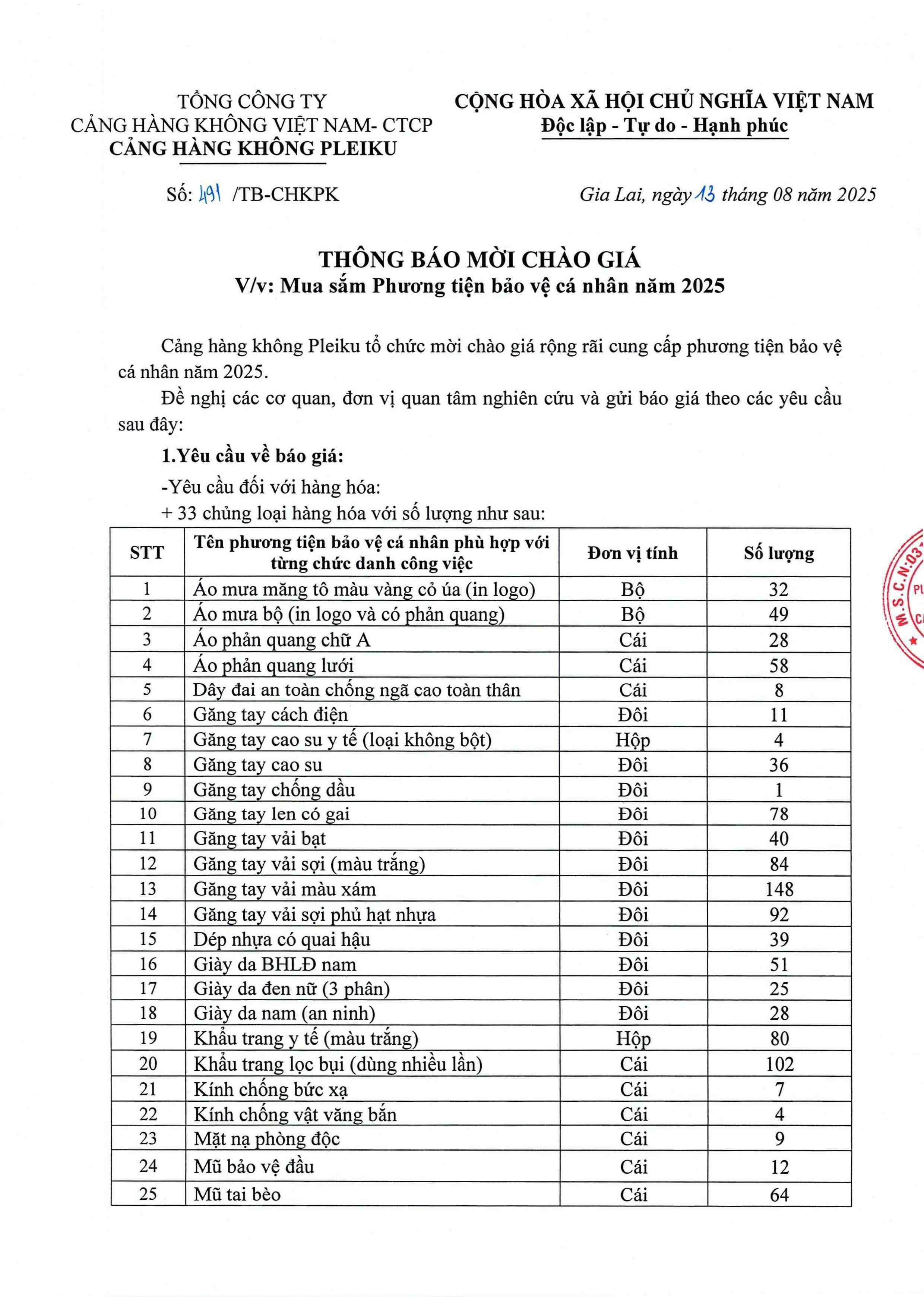 Thông báo mời chào giá: Mua sắm Phương tiện bảo vệ cá nhân năm 2025