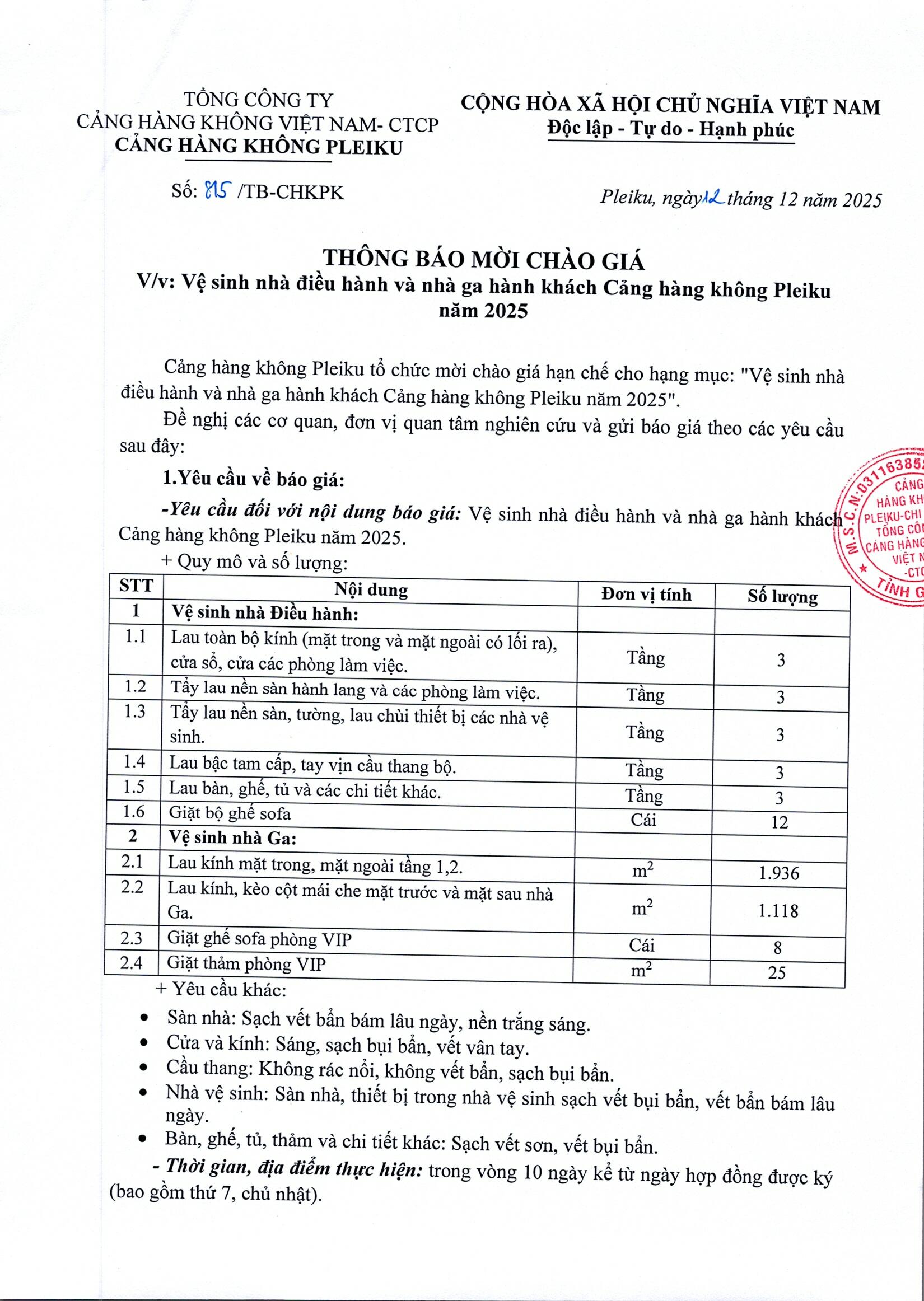 Thông báo mời chào giá vệ sinh nhà điều hành và nhà ga hành khách Cảng hàng không Pleiku