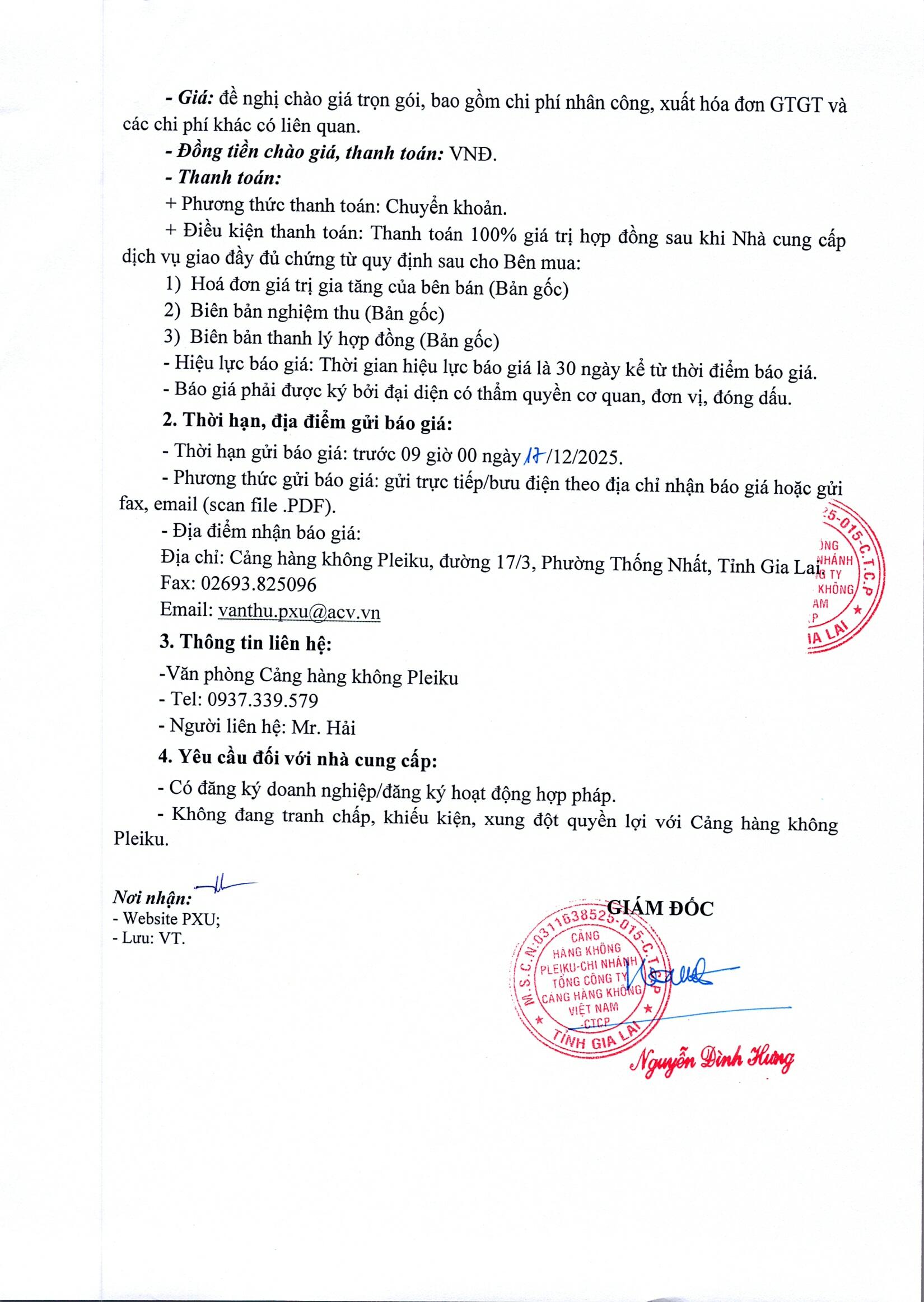 Thông báo về việc Kết quả chào giá “Bảo dưỡng định kỳ hệ thống xử lý nước thải sinh hoạt 06 tháng cuối năm 2025 tại Cảng hàng không Pleiku”