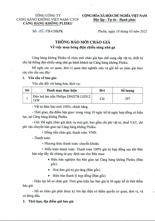 Thông báo mời chào giá: Về việc mua bóng điện chiếu sáng nhà ga