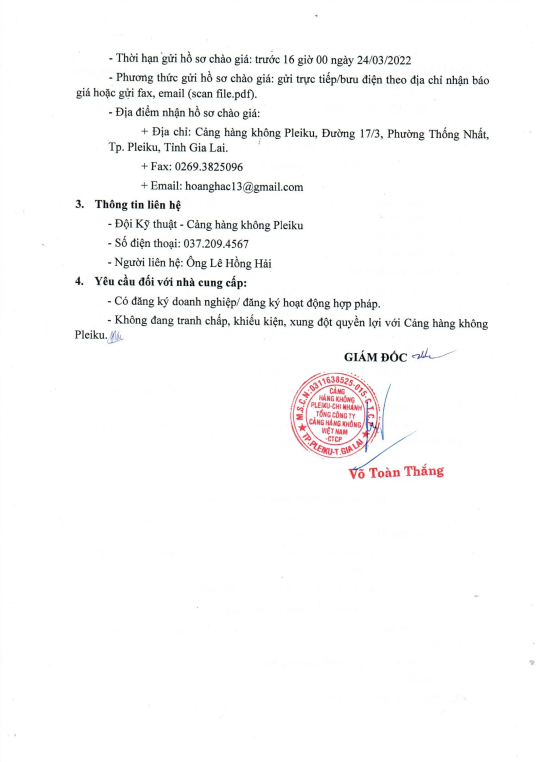 Thông báo về việc Kết quả chào giá “Cung cấp và lắp đặt hệ thống cảnh báo an toàn cho xe thang hành khách tại Cảng hàng không Pleiku”