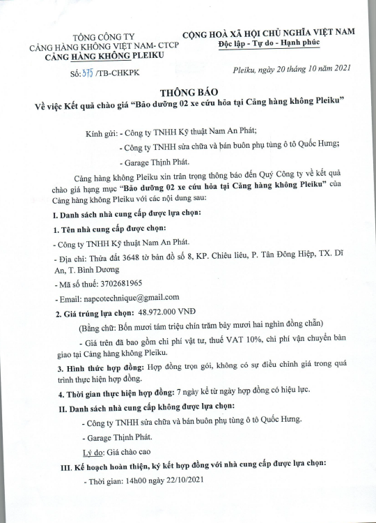 Thông báo về việc Kết quả chào giá “Bảo dưỡng 02 xe cứu hỏa tại Cảng hàng không Pleiku”