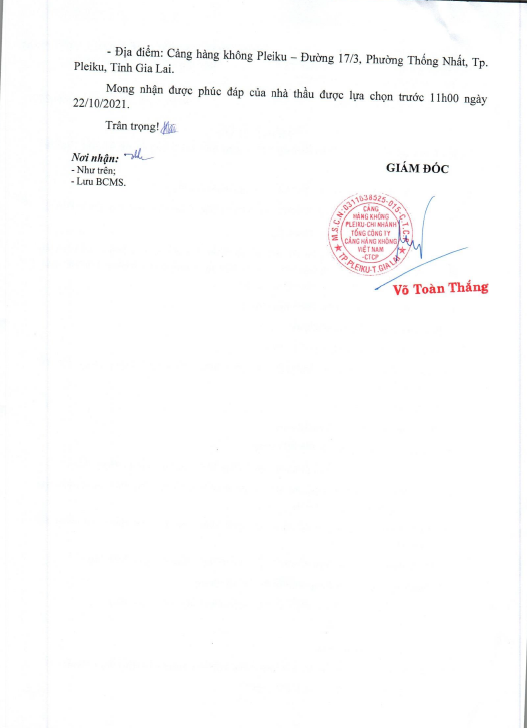 Thông báo về việc Kết quả chào giá “Bảo dưỡng định kỳ hệ thống xử lý nước thải sinh hoạt 06 tháng cuối năm 2025 tại Cảng hàng không Pleiku”