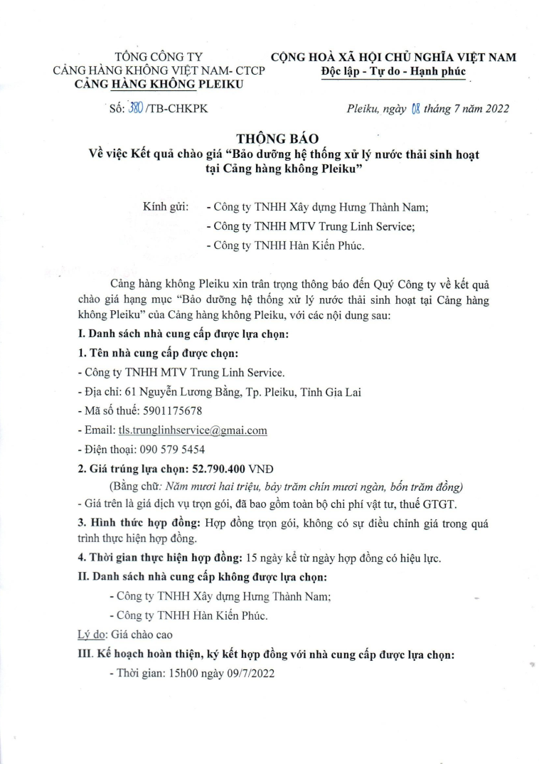 Thông báo về việc Kết quả chào giá “Bảo dưỡng hệ thống xử lý nước thải sinh hoạt tại Cảng hàng không Pleiku”