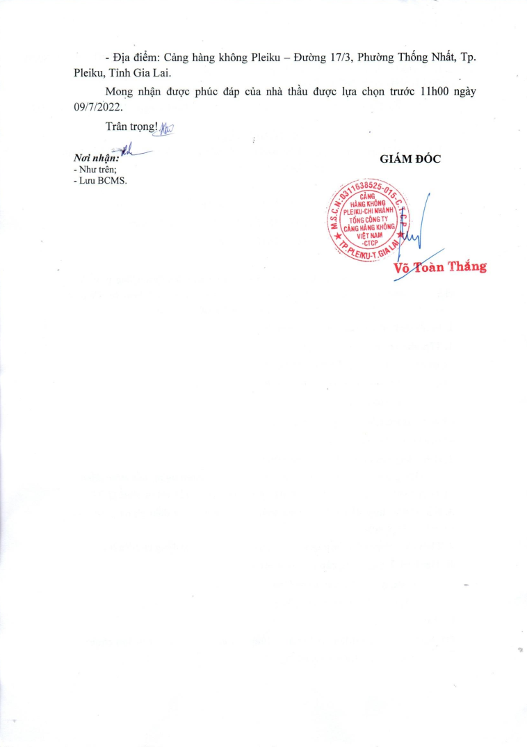 Thông báo về việc Kết quả chào giá “Bảo dưỡng định kỳ hệ thống xử lý nước thải sinh hoạt 06 tháng cuối năm 2025 tại Cảng hàng không Pleiku”