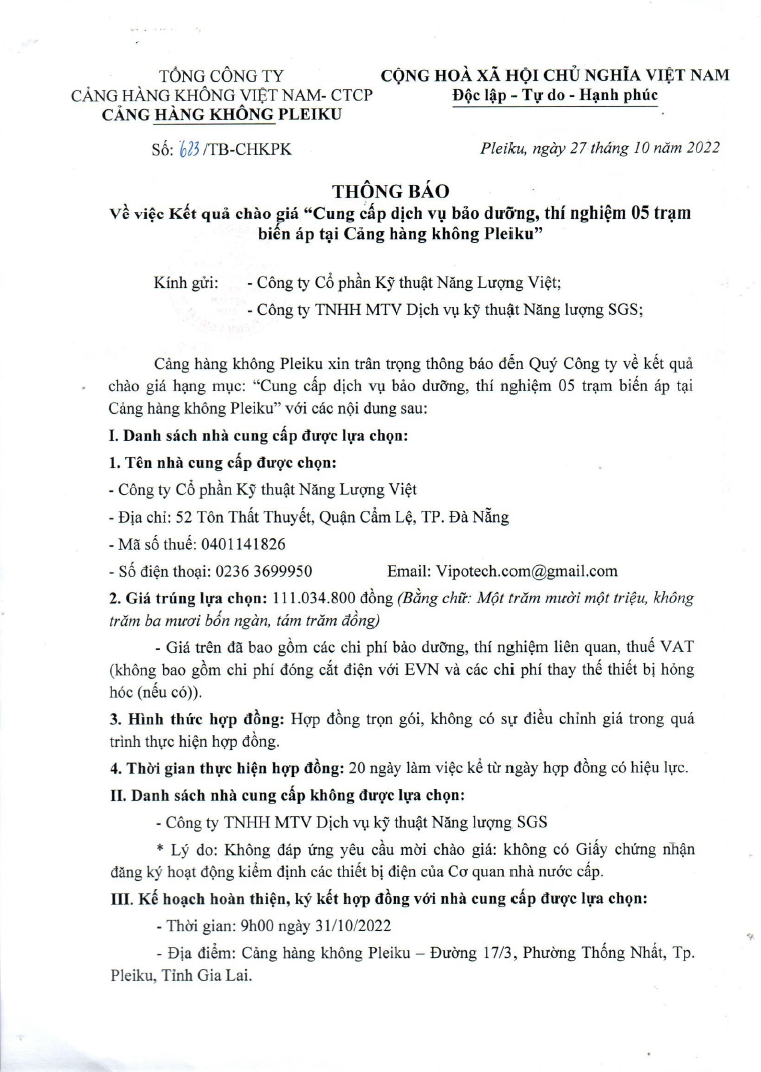 Thông báo về việc Kết quả chào giá “Cung cấp dịch vụ bảo dưỡng, thí nghiệm 05 trạm biến áp tại Cảng hàng không Pleiku”