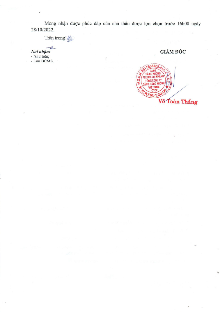 Thông báo về việc Kết quả chào giá “Bảo dưỡng định kỳ hệ thống xử lý nước thải sinh hoạt 06 tháng cuối năm 2025 tại Cảng hàng không Pleiku”