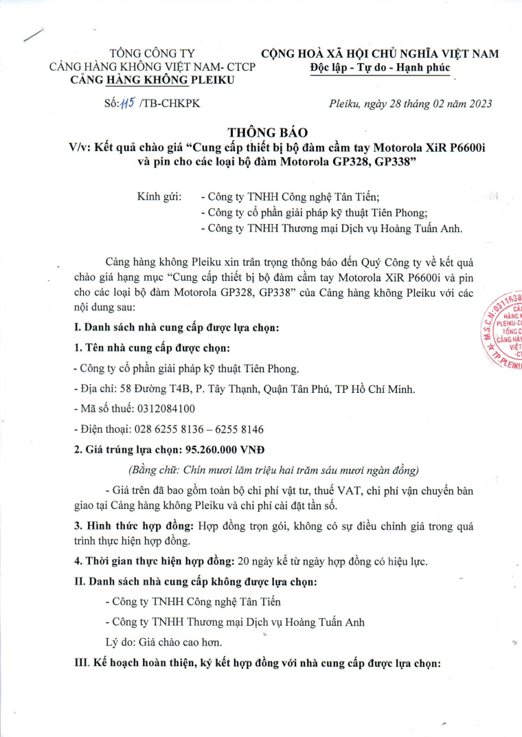 Thông báo về việc Kết quả chào giá “Cung cấp thiết bị bộ đàm cầm tay Motorola XiR P6600i và pin cho các loại bộ đàm Motorola GP328, GP338”