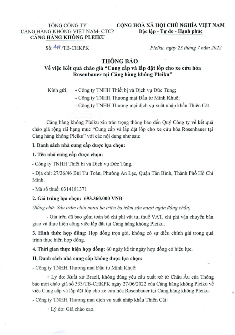 Thông báo về việc Kết quả chào giá “Cung cấp và lắp đặt lốp cho xe cứu hỏa Rosenbauer tại Cảng hàng không Pleiku”