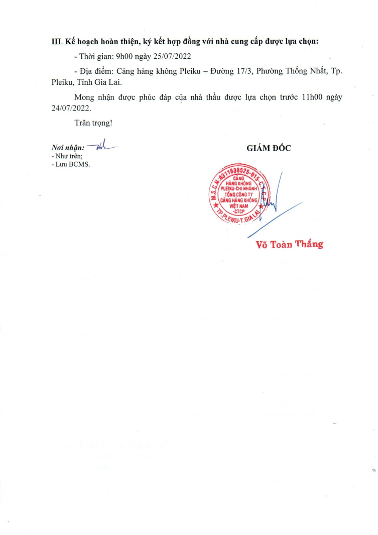 Thông báo về việc Kết quả chào giá “Bảo dưỡng định kỳ hệ thống xử lý nước thải sinh hoạt 06 tháng cuối năm 2025 tại Cảng hàng không Pleiku”