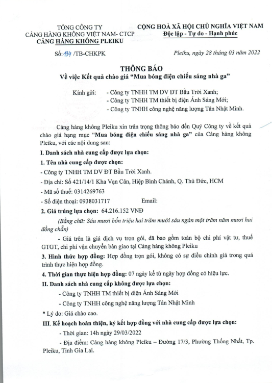Thông báo về việc Kết quả chào giá “Cung cấp và lắp đặt hệ thống cảnh báo an toàn cho xe thang hành khách tại Cảng hàng không Pleiku”