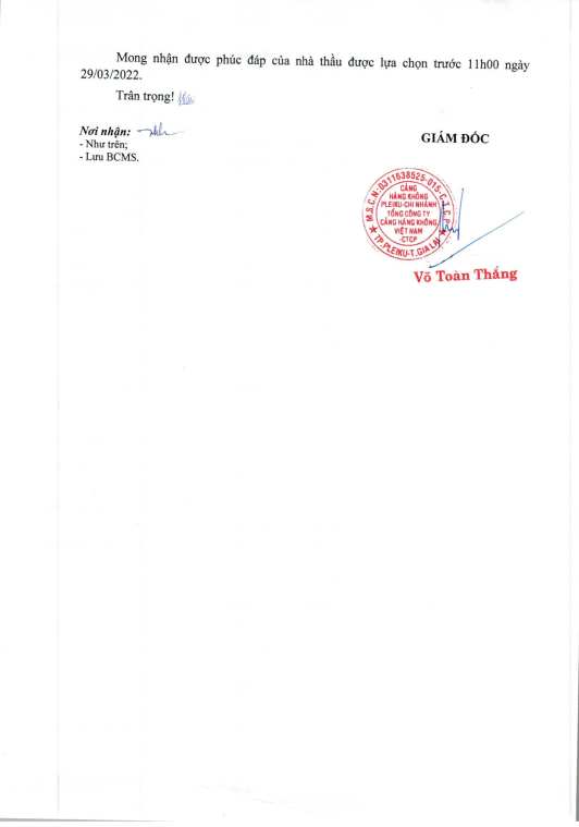 Thông báo về việc Kết quả chào giá “Bảo dưỡng định kỳ hệ thống xử lý nước thải sinh hoạt 06 tháng cuối năm 2025 tại Cảng hàng không Pleiku”
