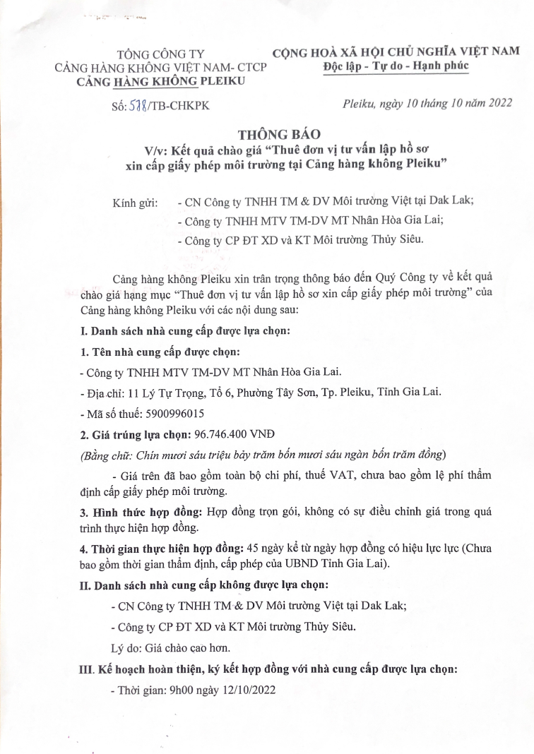 Thông báo về việc Kết quả chào giá “Thuê đơn vị tư vấn lập hồ sơ xin cấp giấy phép môi trường tại Cảng hàng không Pleiku”