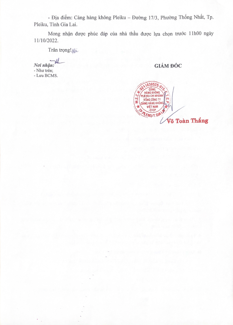 Thông báo về việc Kết quả chào giá “Bảo dưỡng định kỳ hệ thống xử lý nước thải sinh hoạt 06 tháng cuối năm 2025 tại Cảng hàng không Pleiku”