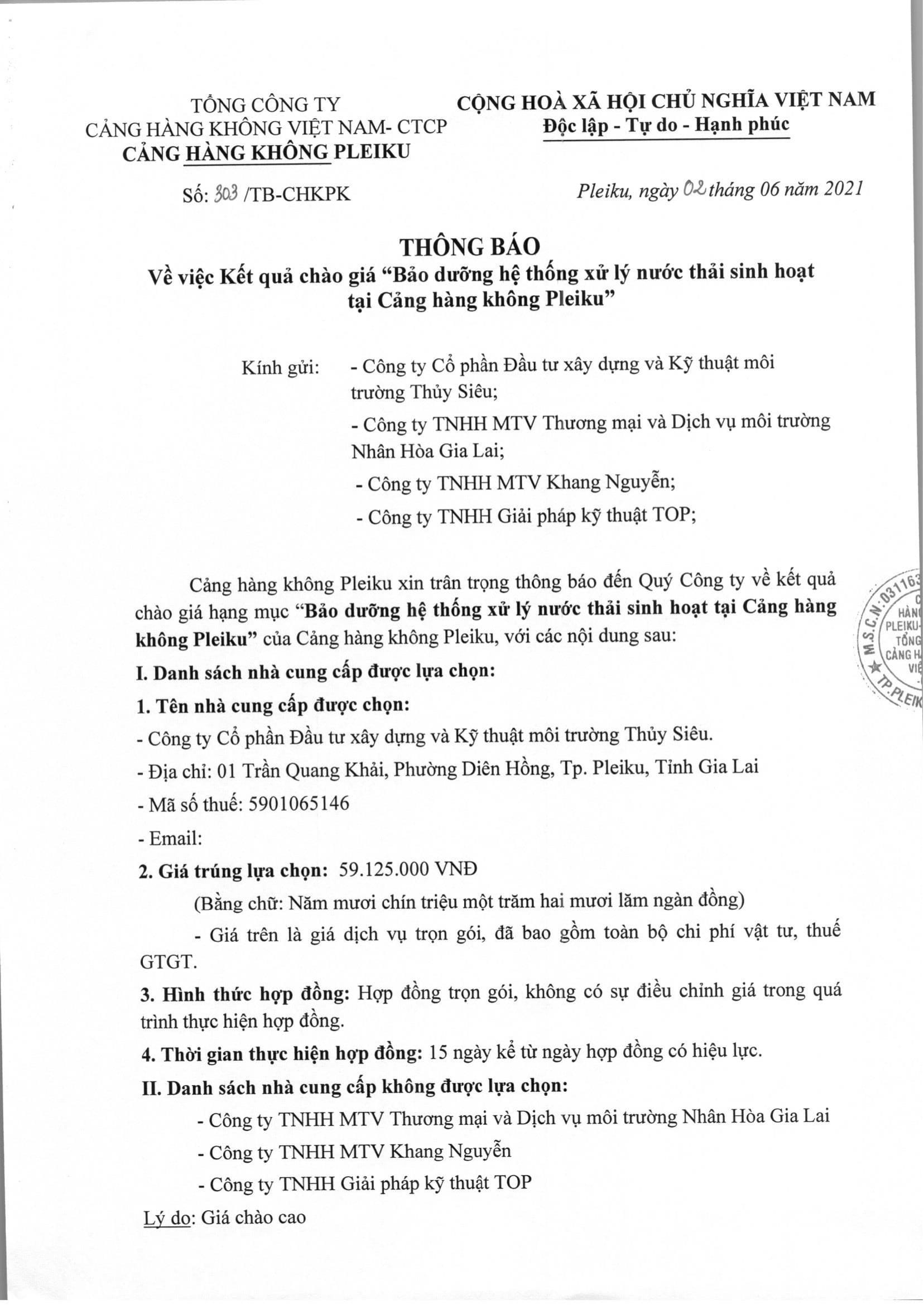 Thông báo kết quả chào giá: Về việc bảo dưỡng hệ thống xử lý nước thải Cảng hàng không Pleiku