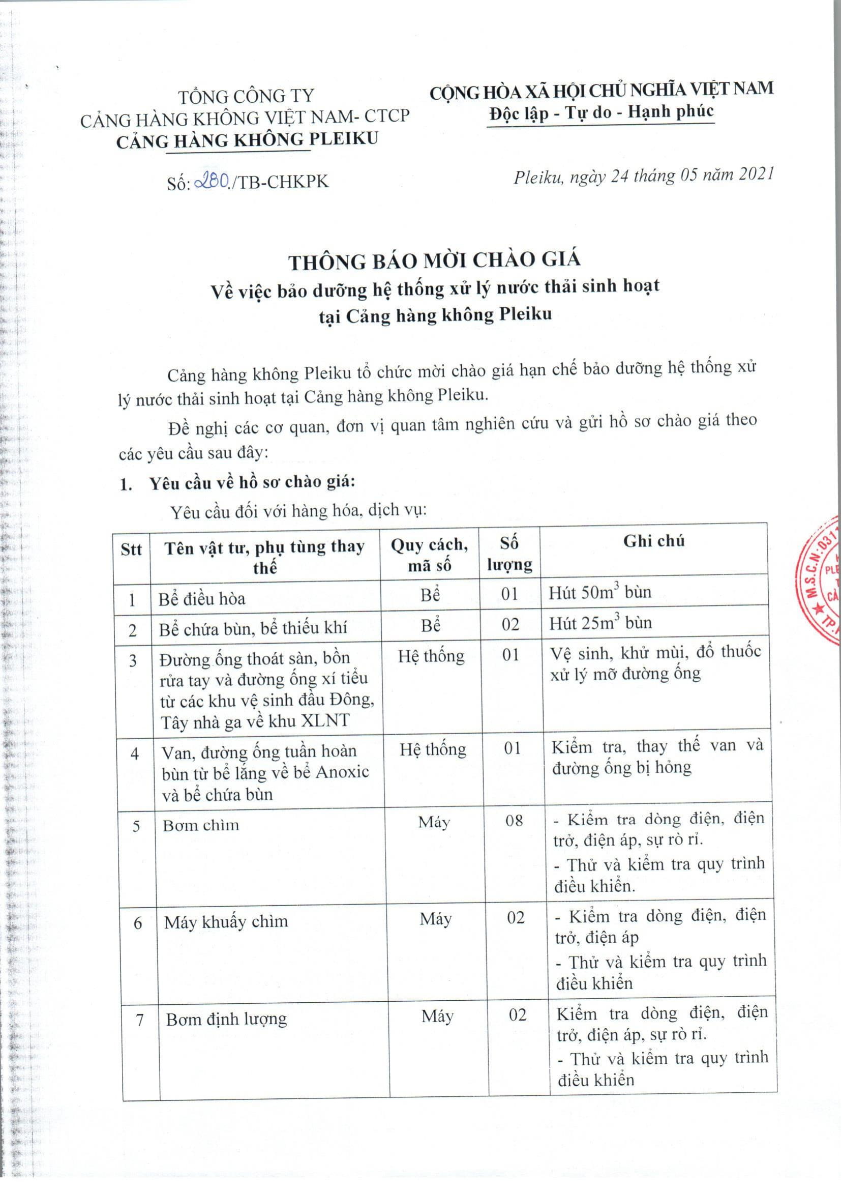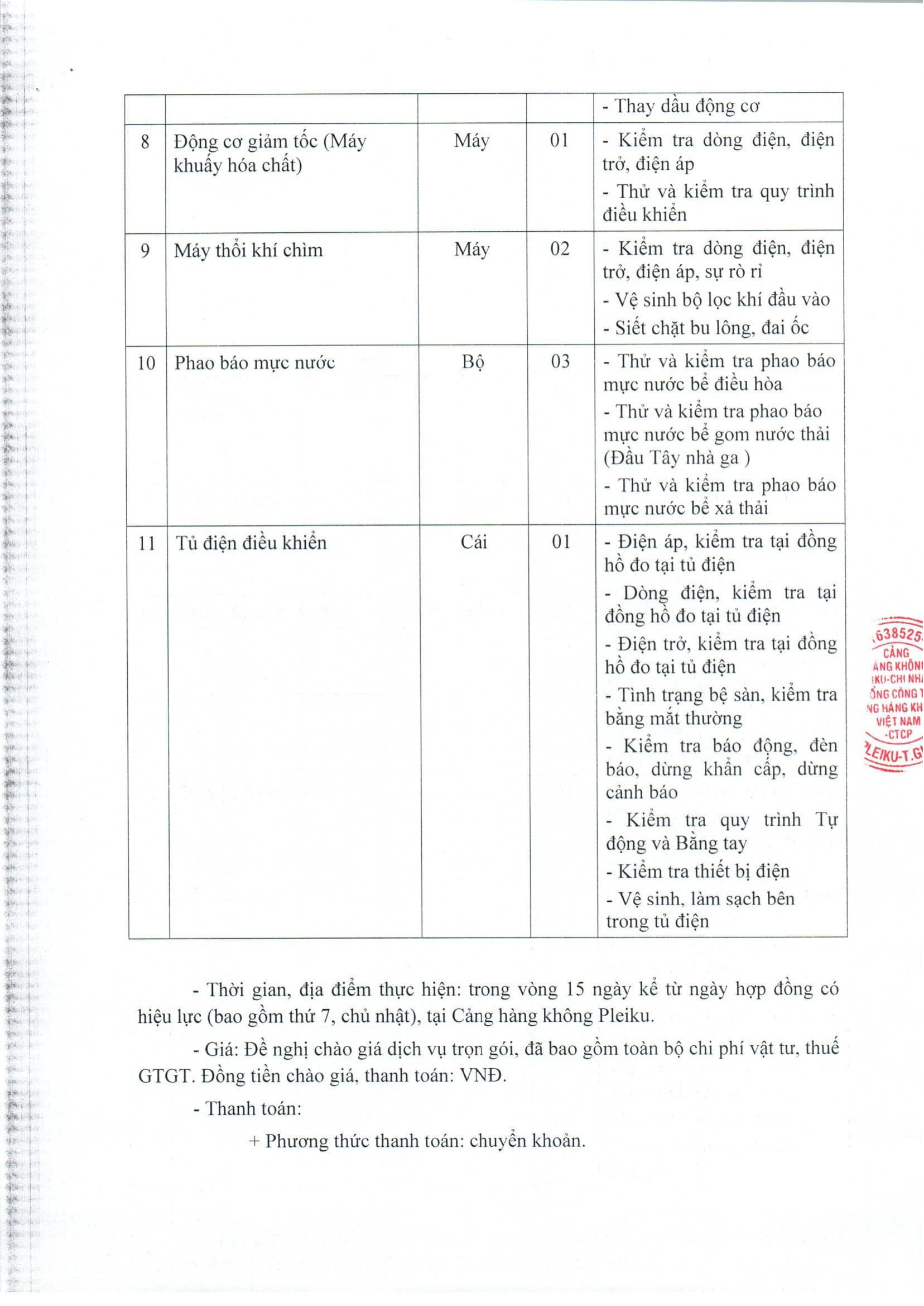 Thông báo mời chào giá: Về việc bảo dưỡng hệ thống xử lý nước thải Cảng hàng không Pleiku