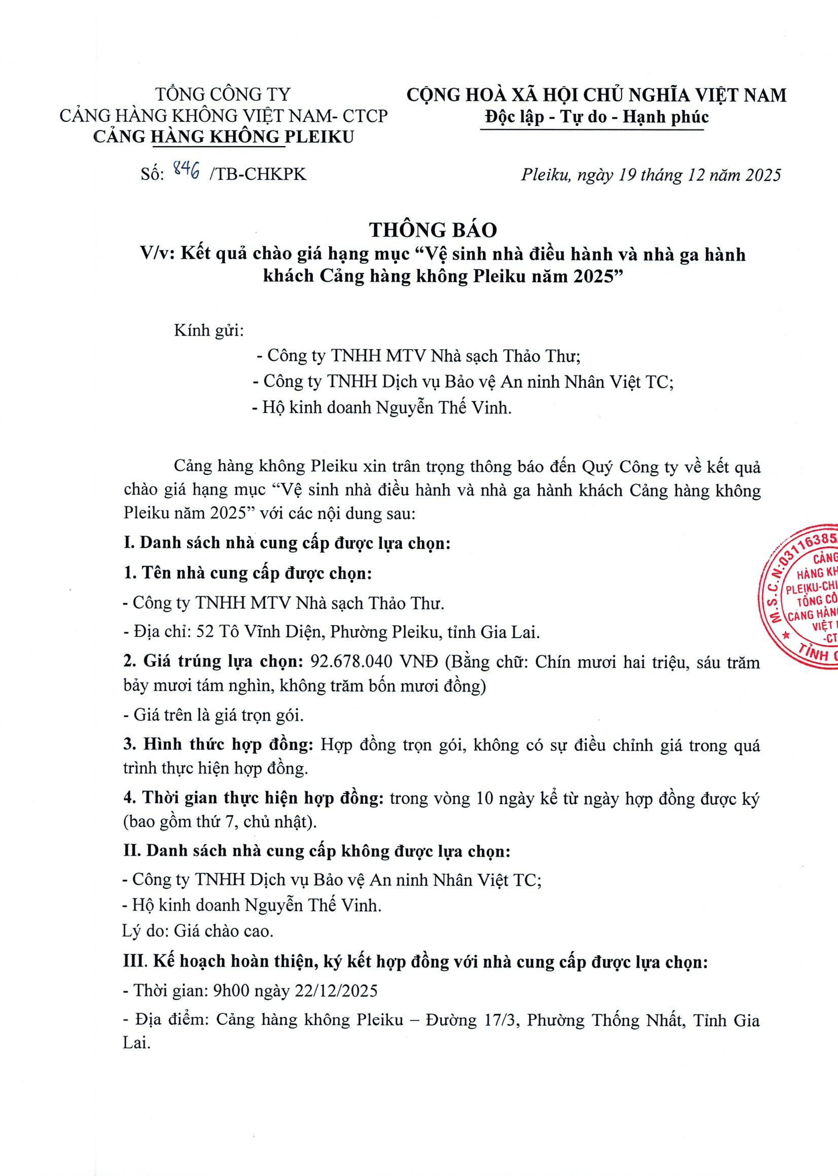 Kết quả chào giá hạng mục: ' Vệ sinh nhà điều hành và nhà ga hành khách Cảng hàng không Pleiku năm 2025"