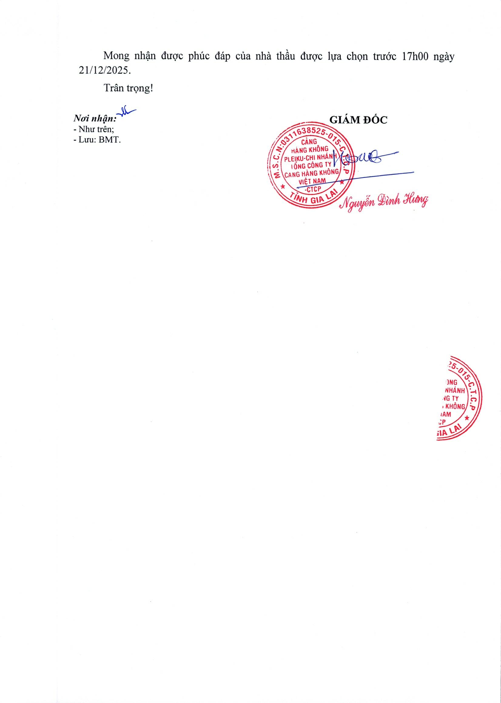 Thông báo về việc Kết quả chào giá "Sửa chữa, cải tạo hệ thống cấp mạng SCN tại phòng kỹ thuật - Nhà ga hành khách Cảng hàng không Pleiku"