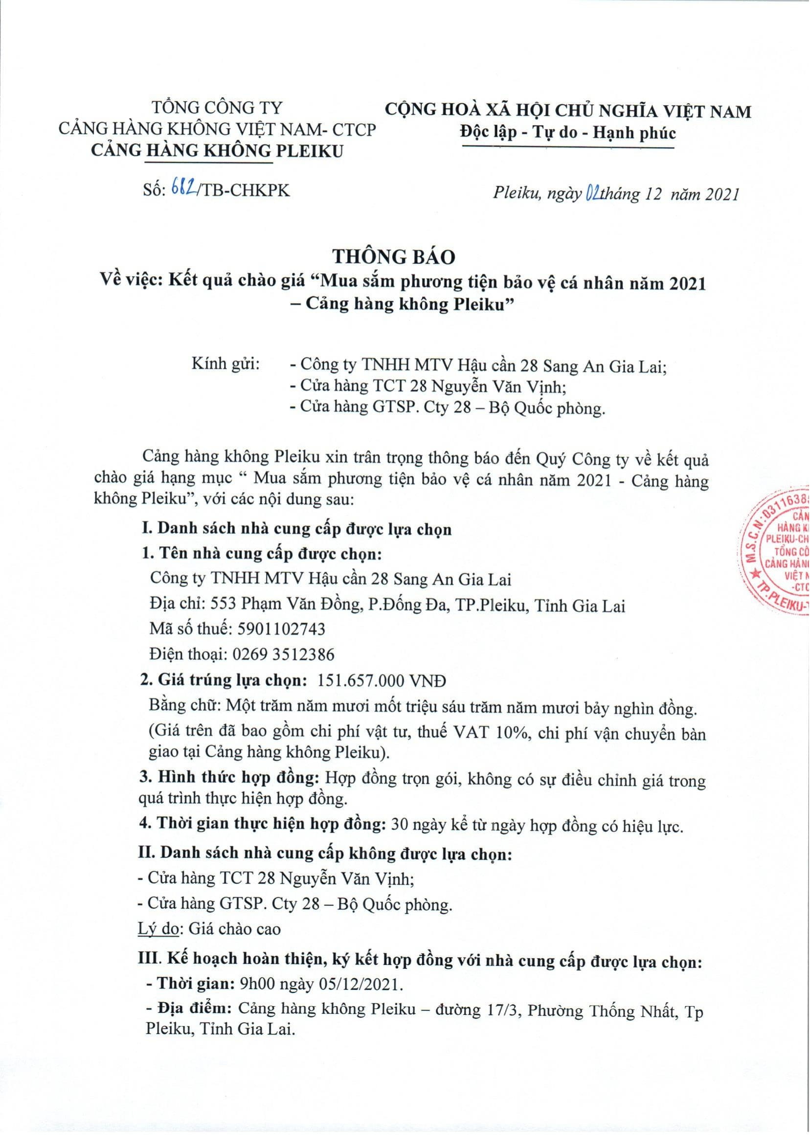 Thông báo kết quả chào giá: Mua sắm phương tiện bảo vệ cá nhân năm 2021 - Cảng hàng không Pleiku