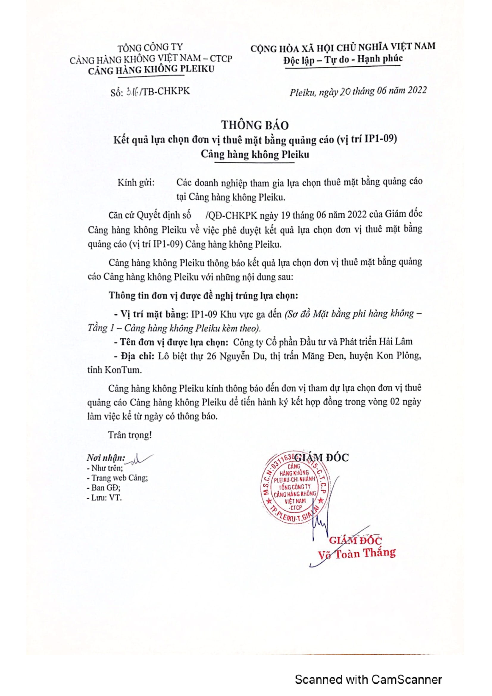 Thông báo kết quả lựa chọn đơn vị thuê mặt bằng quảng cáo tại Cảng hàng không Pleiku