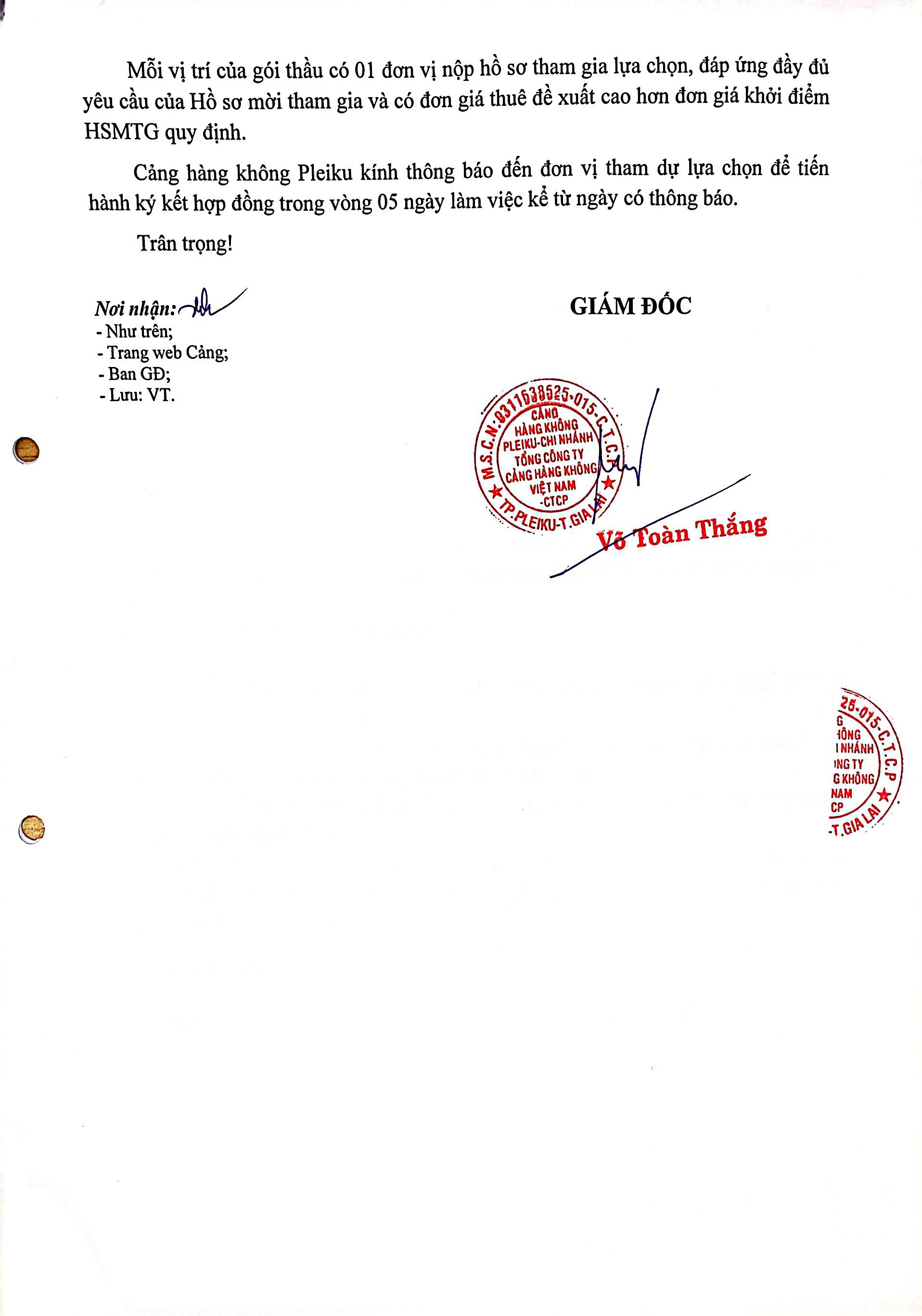 Thông báo về việc Kết quả chào giá "Sửa chữa, cải tạo hệ thống cấp mạng SCN tại phòng kỹ thuật - Nhà ga hành khách Cảng hàng không Pleiku"