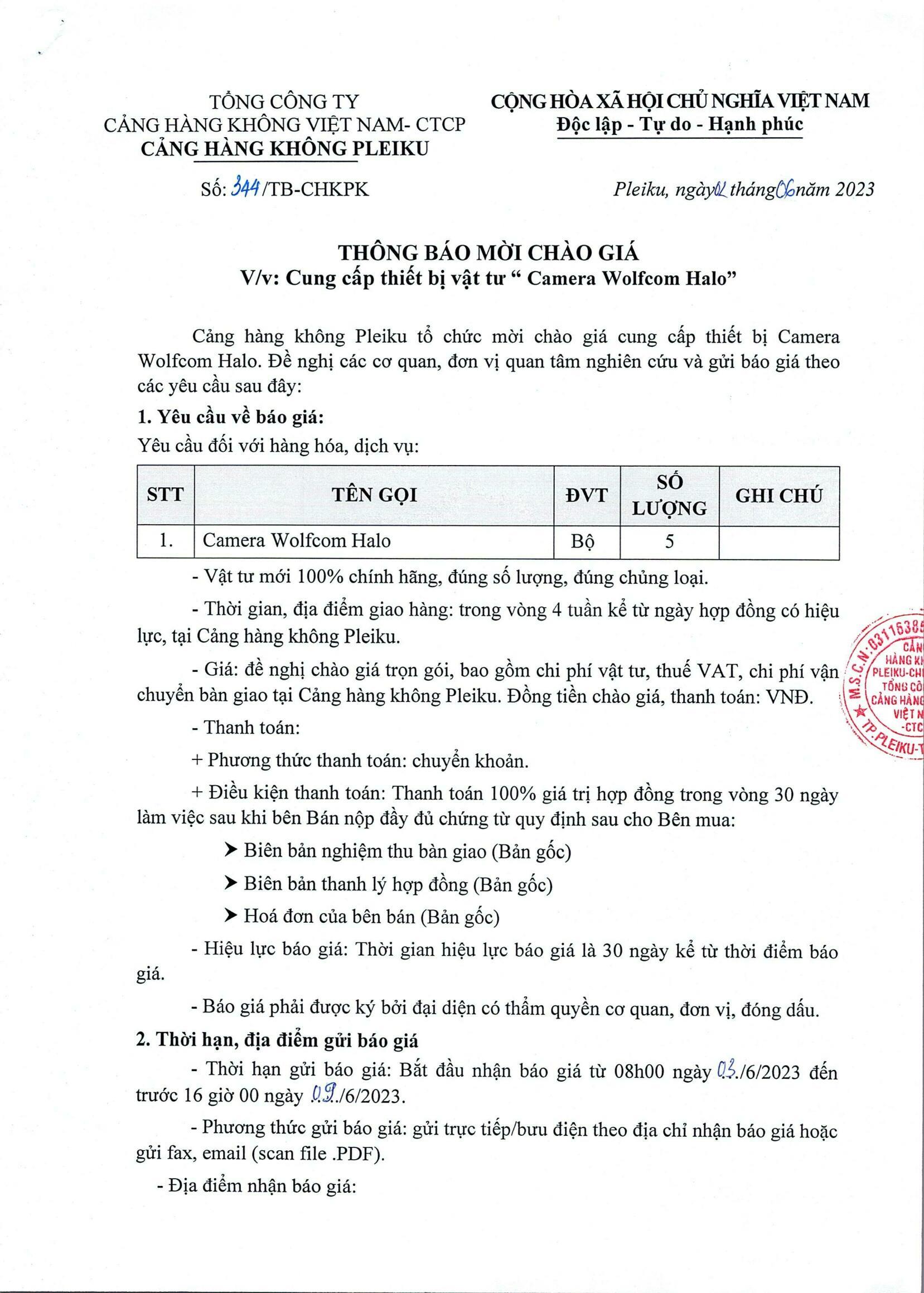 Thông báo mời chào giá: Cung cấp thiết bị vật tư "Camera Wolfcom Halo"