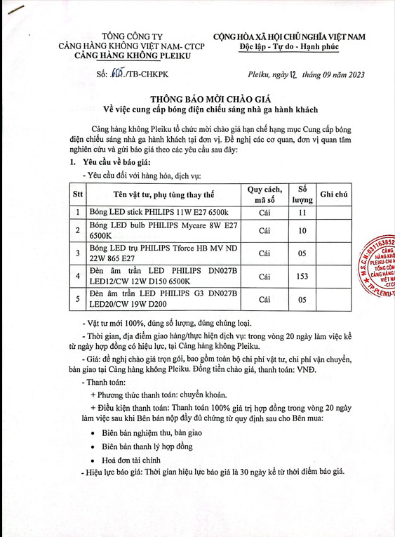Thông báo mời chào giá về việc cung cấp bóng điện chiếu sáng nhà ga hành khách