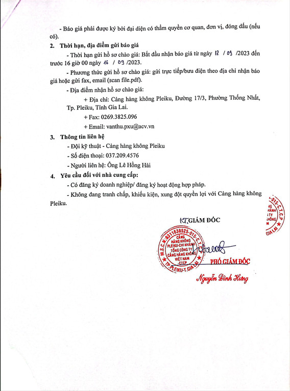 Thông báo mời chào giá về việc "Sửa chữa, cải tạo hệ thống cáp mạng SCN tại phòng kỹ thuật - Nhà ga hành khách Cảng hàng không Pleiku"