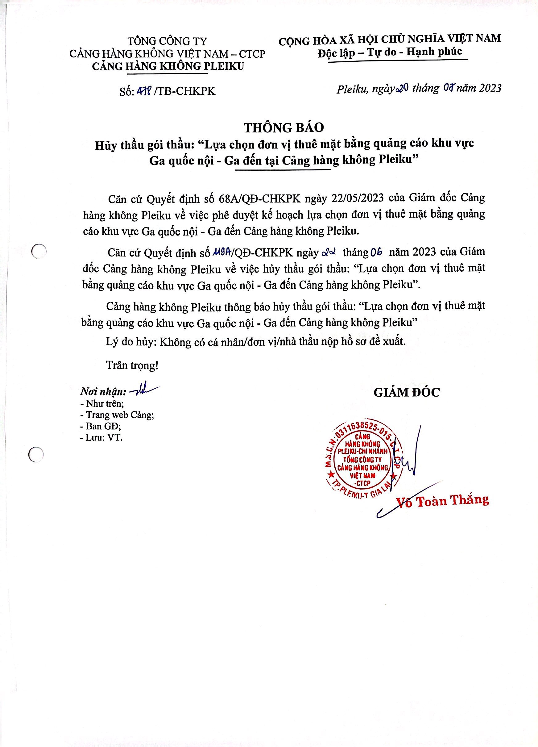 Thông báo hủy gói thầu Lựa chọn đơn vị thuê mặt bằng quảng cáo Khu vực ga quốc nội - Ga đến tại Cảng hàng không Pleiku