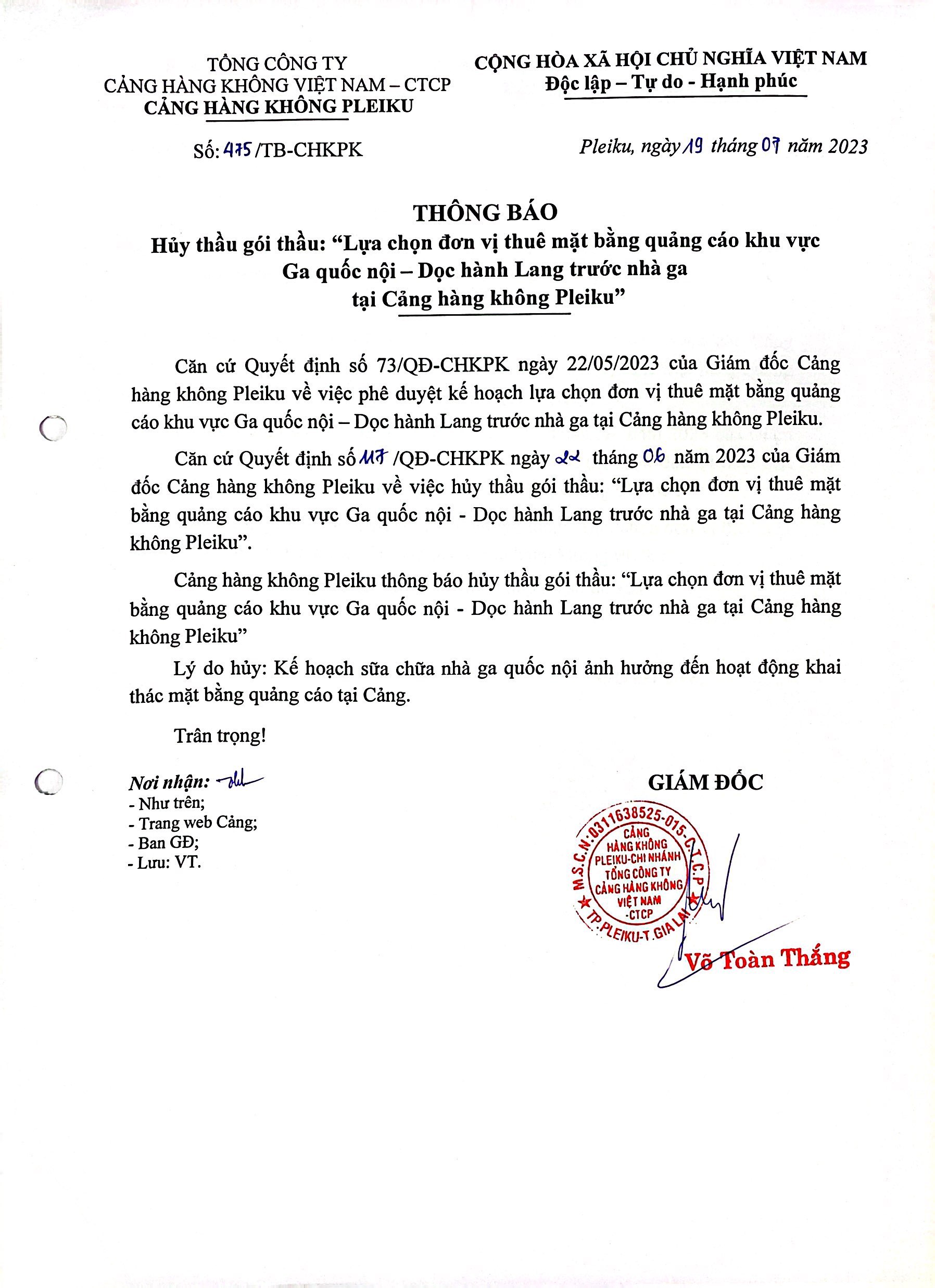 Thông báo hủy gói thầu Lựa chọn đơn vị thuê mặt bằng quảng cáo Khu vực ga quốc nội - Dọc hành lang trước nhà ga tại Cảng hàng không Pleiku
